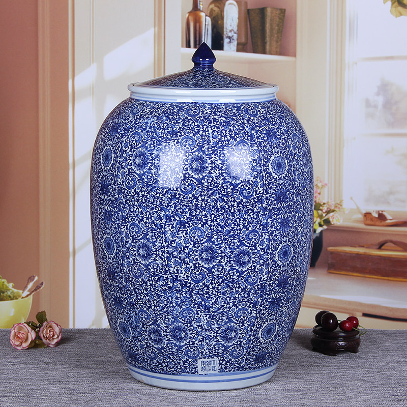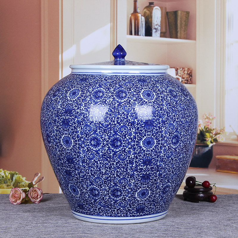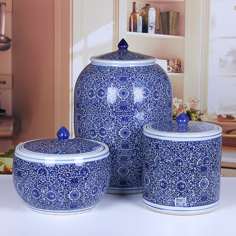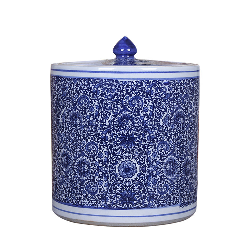 Джингдежэнь старого стиля ретро -керамический рисовый цилиндр рисовый бак дом 10/20/50 Кот с синим и белым запечатанным резервуаром для хранения