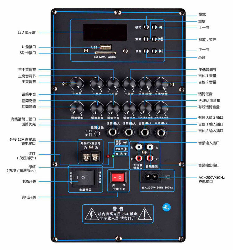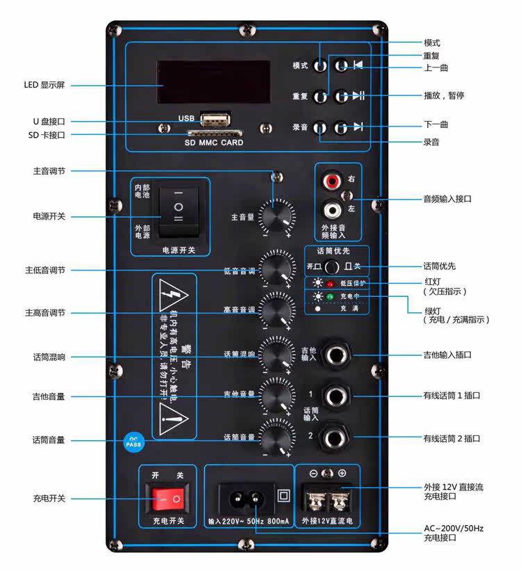 Функция силовой гитары, двухцелевая DC, защита зарядки и разряда, с микрофонами OK вход.