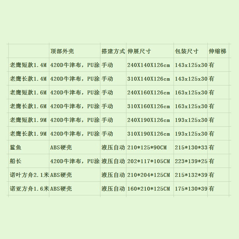 | Цвет: | Орл 1.4*2,4 Следуйте 1,4*1,25, Орл 1.4*3.1 Следуйте 1,4*1,25, Орл 1.6*2,4 Следуйте 1,6*1,25, Орл 1.6*3.1 Закройте 1,6*1,25, Орл 1.9*2,4 Следуйте 1,9*1,25, Орл 1.9*3.1 Следуйте 1,9*1,25, Shark Hard Shell Automatic 2.1*1,25 Следуйте 2.1*1,25, Captain Soft Shell Automatic 2*1,2 Следуйте 2*1,2, Noah's Ark Hard Shell Automatic 1,6*2 подходит 1,6*1,25, Noah's Ark Hard Shell Automatic 2.1*2 подходит 2.1*1,25, Shark Hard Shell Automatic 2.1*1,4 Следуйте 2.1*1,4, Индивидуальная крыша палатка |