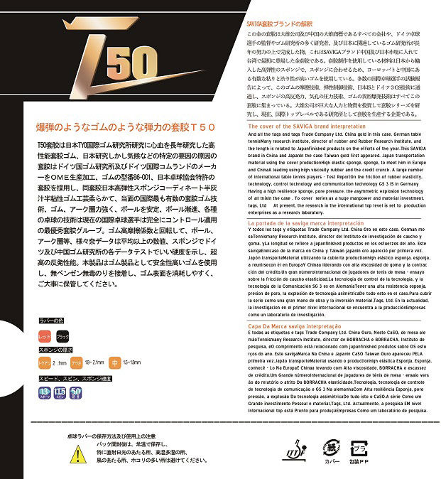 Резиновая крышка Savika T50 с резиновой резиной изготовлена из японской технологии. Исходя из исходной быстрой скорости и высокого трения, он использует более упругую губку и резину с высоким трением, чтобы этот резиновый покров был более сильной агрессивностью и дуговыми характеристиками. Это резина, подходящая для игроков с быстрыми атаками. Толщина губки 2,1 мм, губчатая твердость 50º(Международный стандарт).