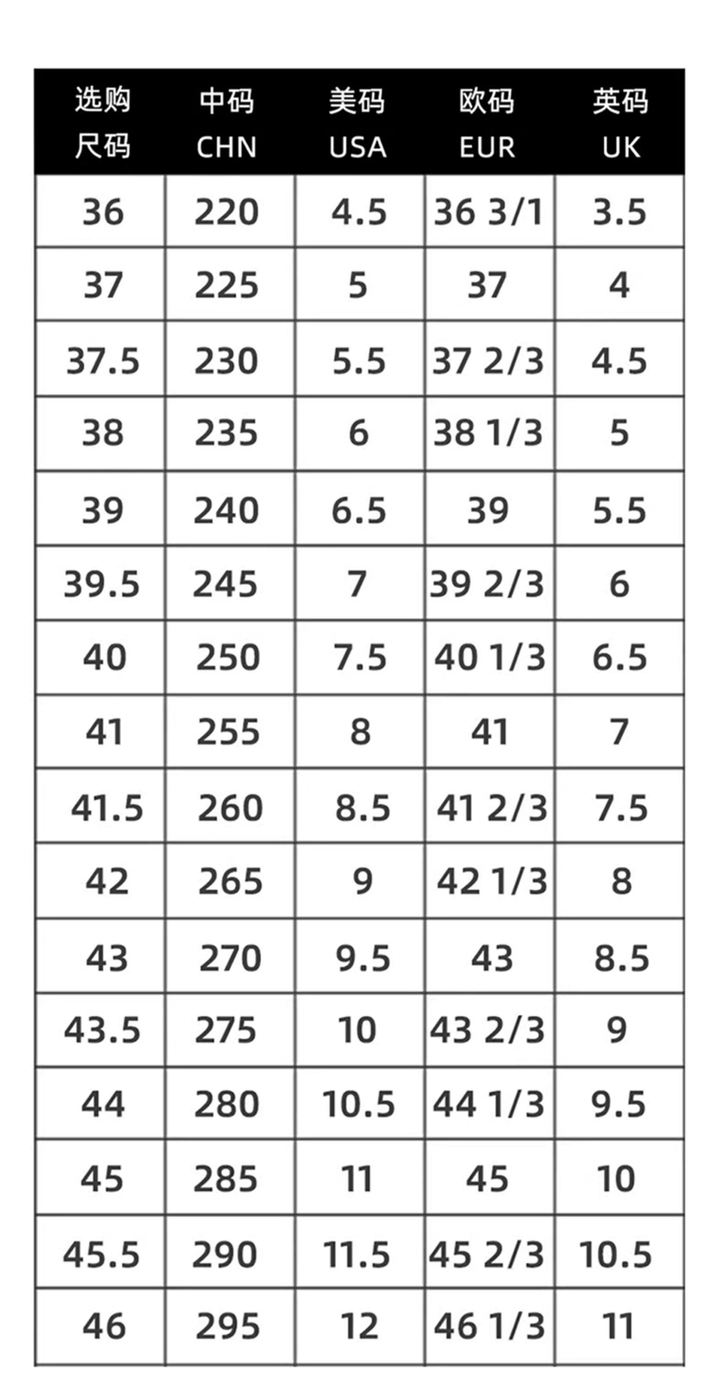 | Размер обуви: | 36/220, 37/225, 37.5/230, 38/235, 39/240, 39.5/245, 40/250, 41/255, 41.5/260, 42/265, 43/270, 43.5/275, 44/280, 45/285, 46/290 |