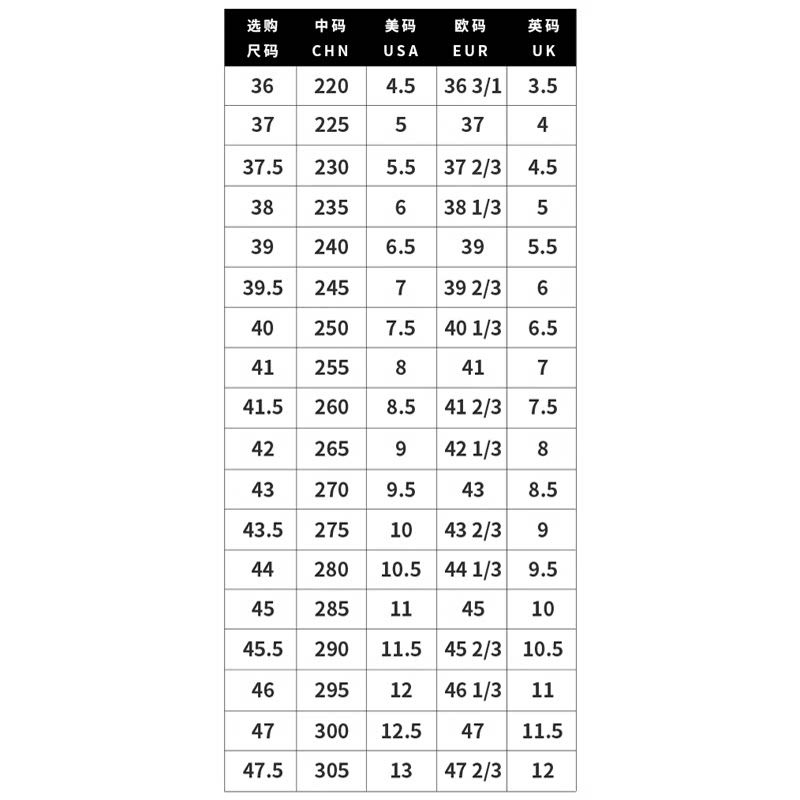 | Размер обуви: | 36/4,5 ярда, 37/5 ярдов, 37,5/5,5 ярдов, 38/6 ярдов, 39/6,5 ярдов, 39,5/7 ярдов, 40/7,5 ярдов, 41/8 ярдов, 41,5/8,5 ярдов, 42/9 ярдов, 43/9,5 ярдов, 43,5/10 ярдов, 44/10,5 ярдов, 45/11 код, 46/11,5 Код |