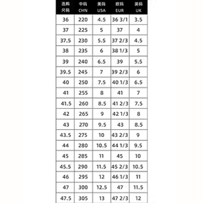 | Размер обуви: | 36 /220, 37/225, 37.5 /230, 38/235, 39 /240, 39.5/245, 40 /250, 41/255, 41.5/260, 42 /265, 43/270, 43.5/275, 44/280, 45/285, 46/295 |