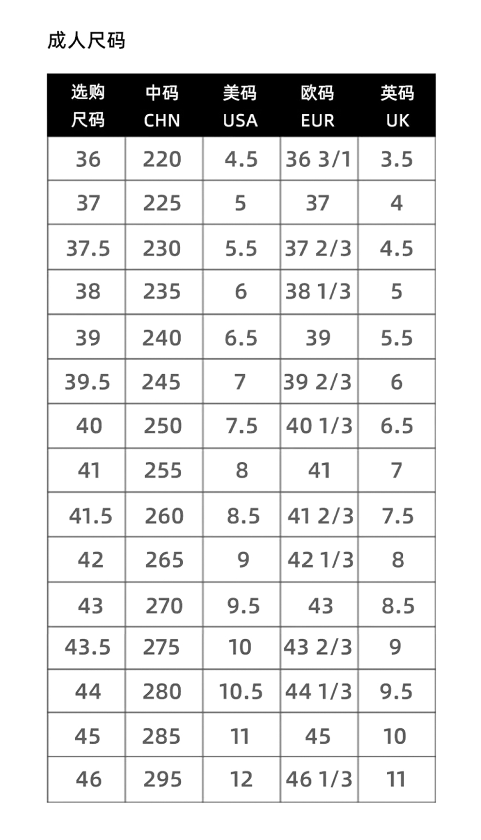 | Размер обуви: | 36/220, 37/225, 37.5/230, 38/235, 39/240, 39.5/245, 40/250, 41/255, 41.5/260, 42/265, 43 /270, 43.5/275, 44/280, 45/285 |