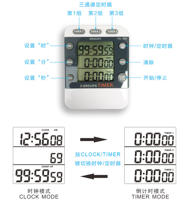 В обратном отсчете нажмите“CLOCK/TIMER” клавиша введите состояние часов, не влияет на обратный отсчет, а затем нажмите“CLOCK/TIMER&Rdquo; ключ, вернуться в состояние обратного отсчета, часы и обратный отсчет не мешают друг другу.