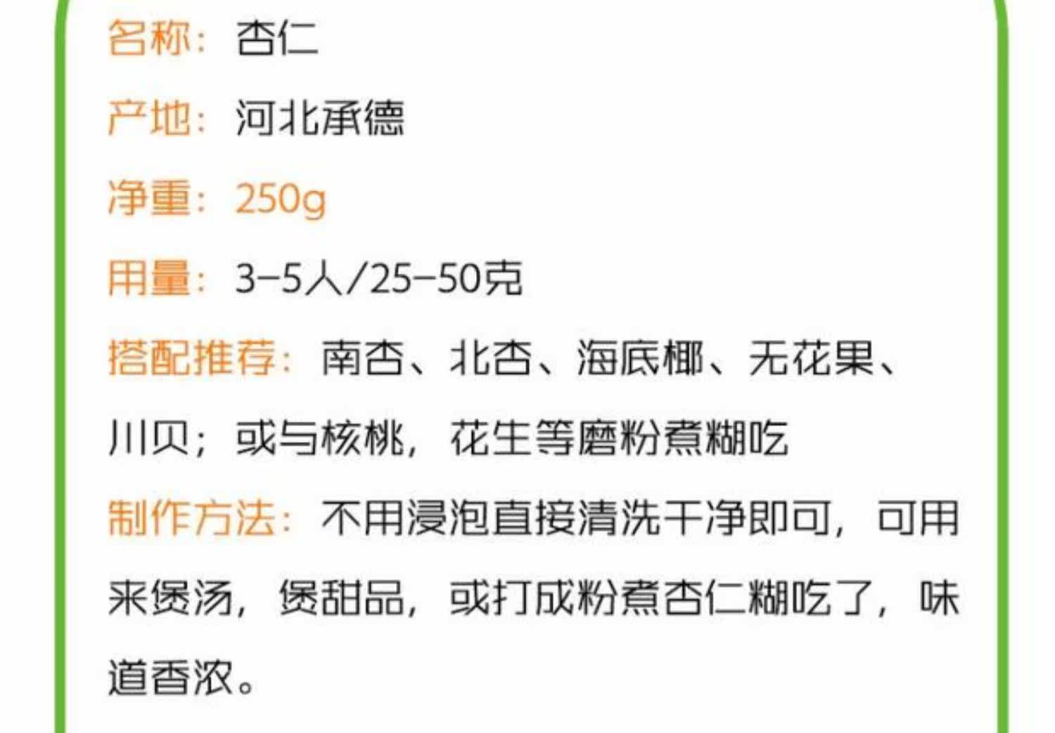 Guanyin Chengde в свете абрикоса 250 г оригинальный северный абрикос, очищенный сладкий южный миндаль, может использовать соевые молочные миндальные суп -суп -суп