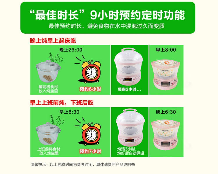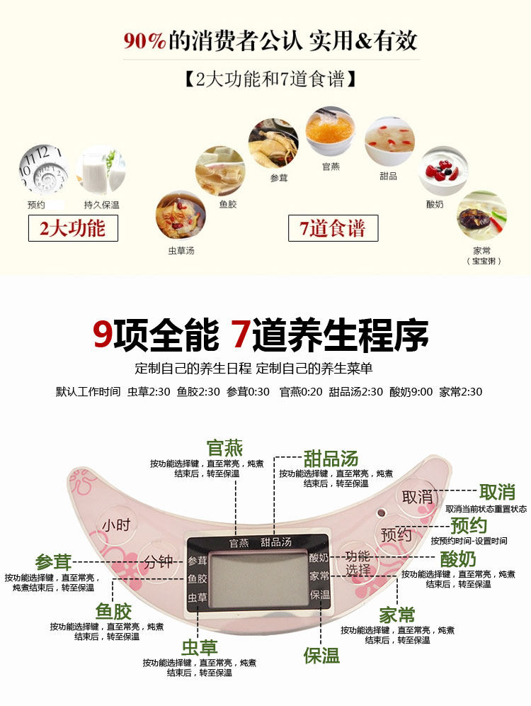 Например, гнездо с тушеным птичьим гнездам непосредственно, чтобы выбрать функцию официальной ласточки, тушеный клей рыб непосредственно выбирает функцию рыбного клея, а йогурт выбирает функцию йогурта. Если кара BB требуется, чтобы непосредственно выбрать общую функцию дома. , Время рагу также может быть скорректировано в соответствии с той степени, которую вы хотите тушить, интуитивно понятная, интуитивно понятная и экономия