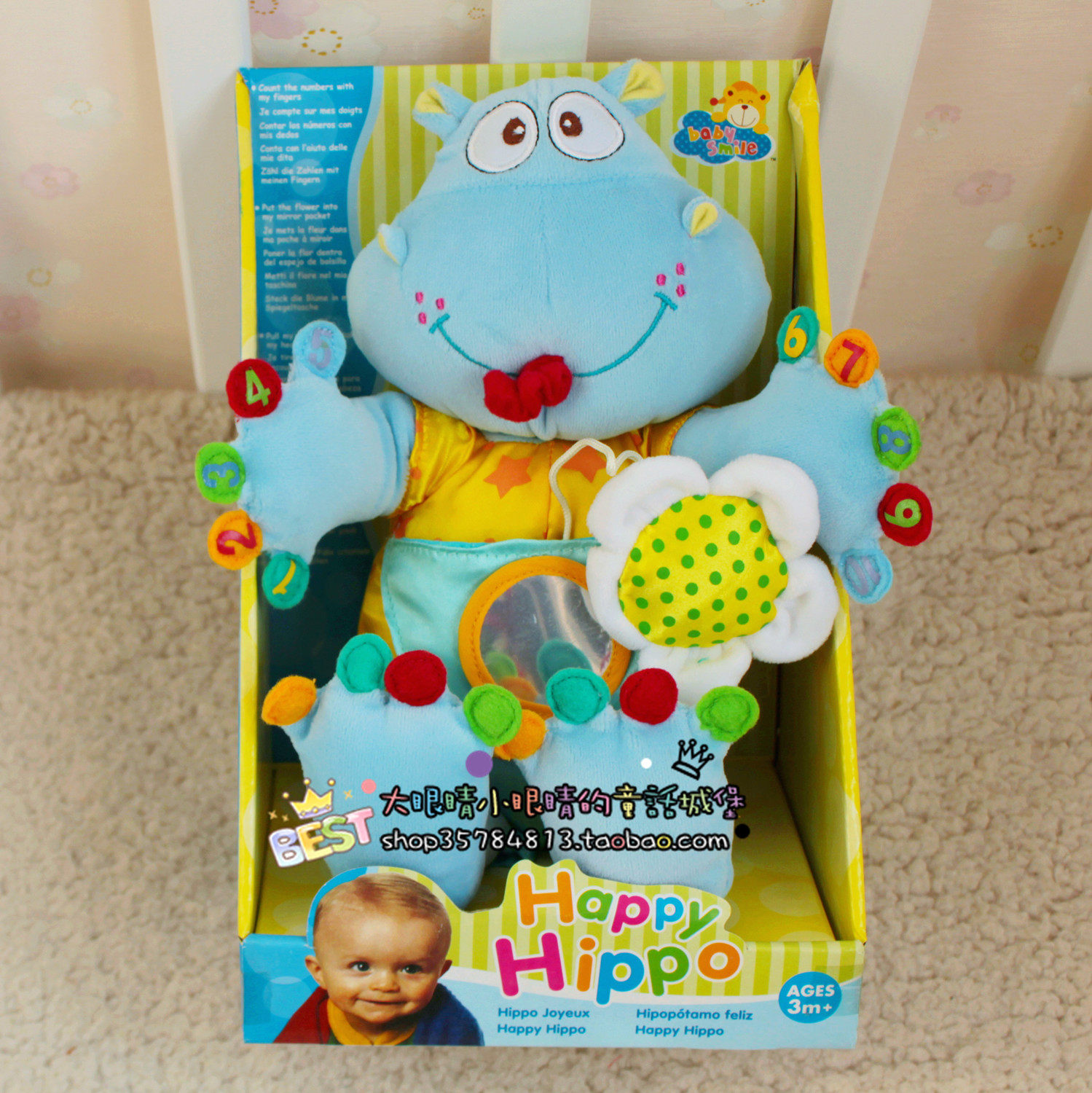 На груди большой бегемотБезопасное зеркало (на зеркале безопасности есть защитная пленка, пожалуйста, отрыть перед использованием),Когда ребенок видит свое лицо или фигурирование через зеркало безопасности, он улыбается, трогает, трясет, хлопает и даже отскочит, и может отличаться от других.Полностью проявлять развитие спортивных навыков мышц и чувствительности.
