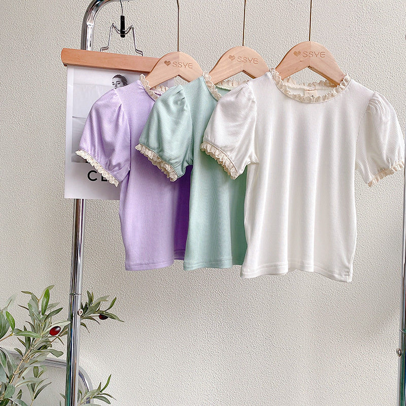Хлопковая трикотажная кружевная летняя летняя одежда, детская футболка, кружевное платье, рукава фонарики, в корейском стиле