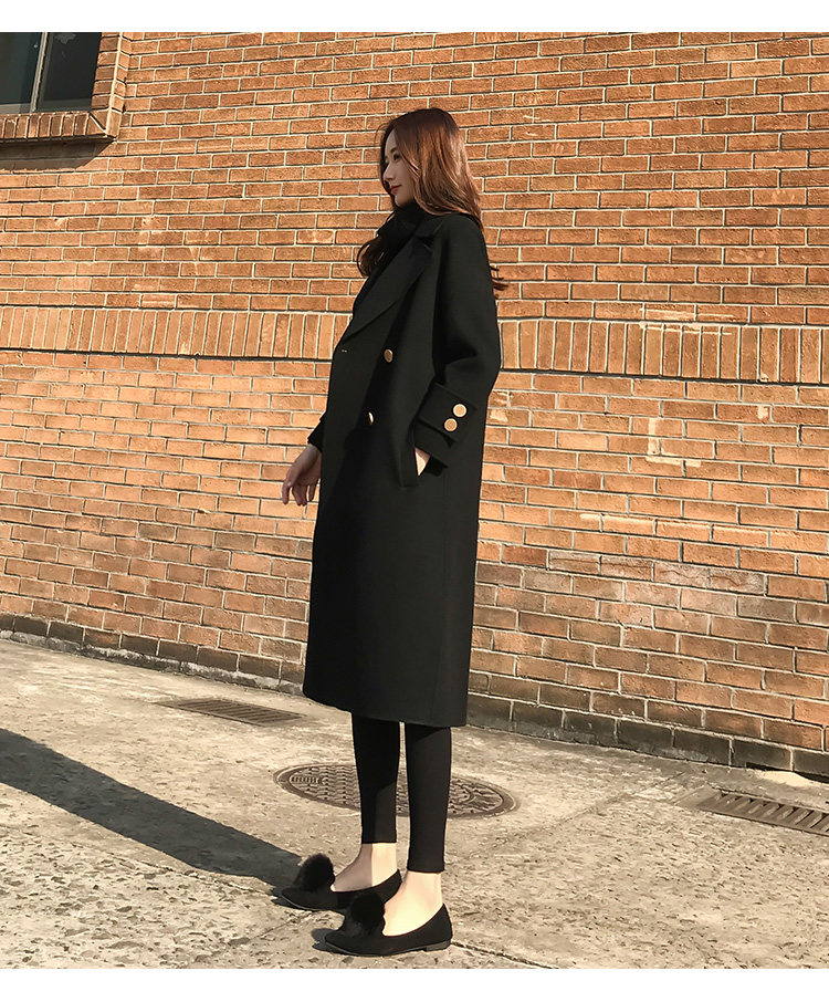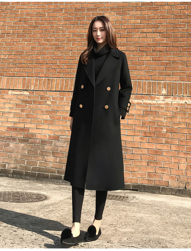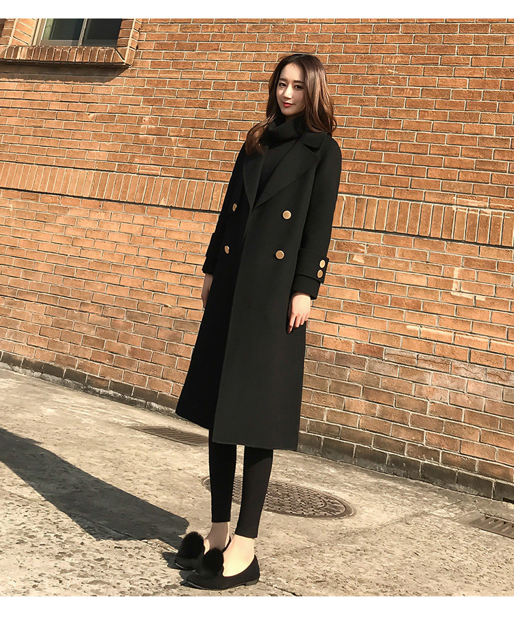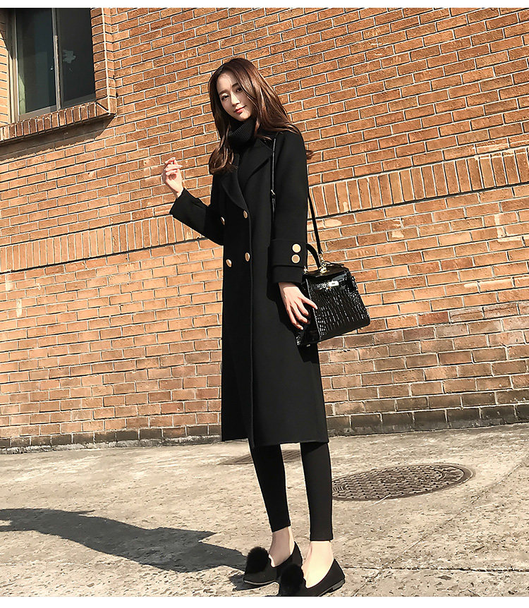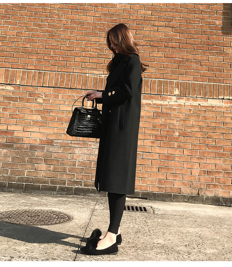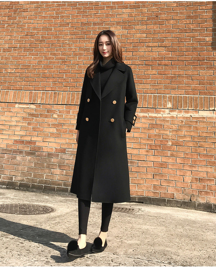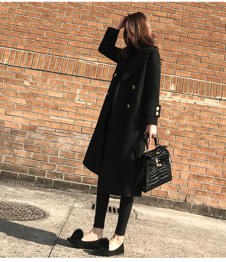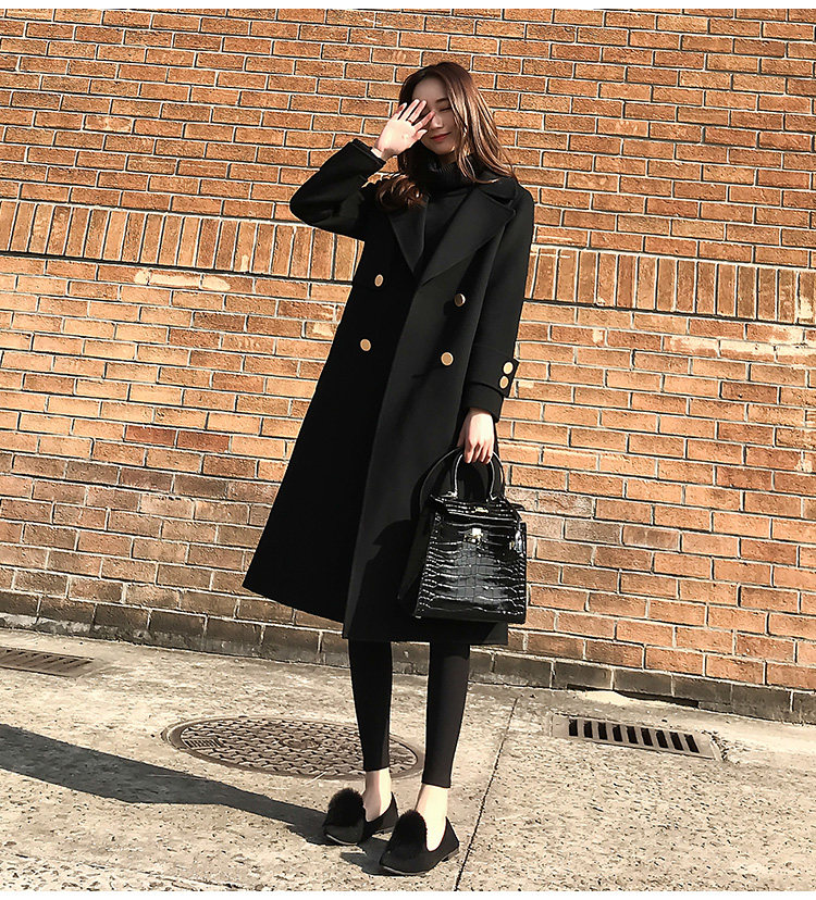 Демисезонное шерстяное пальто, длинная черная куртка, в корейском стиле, средней длины