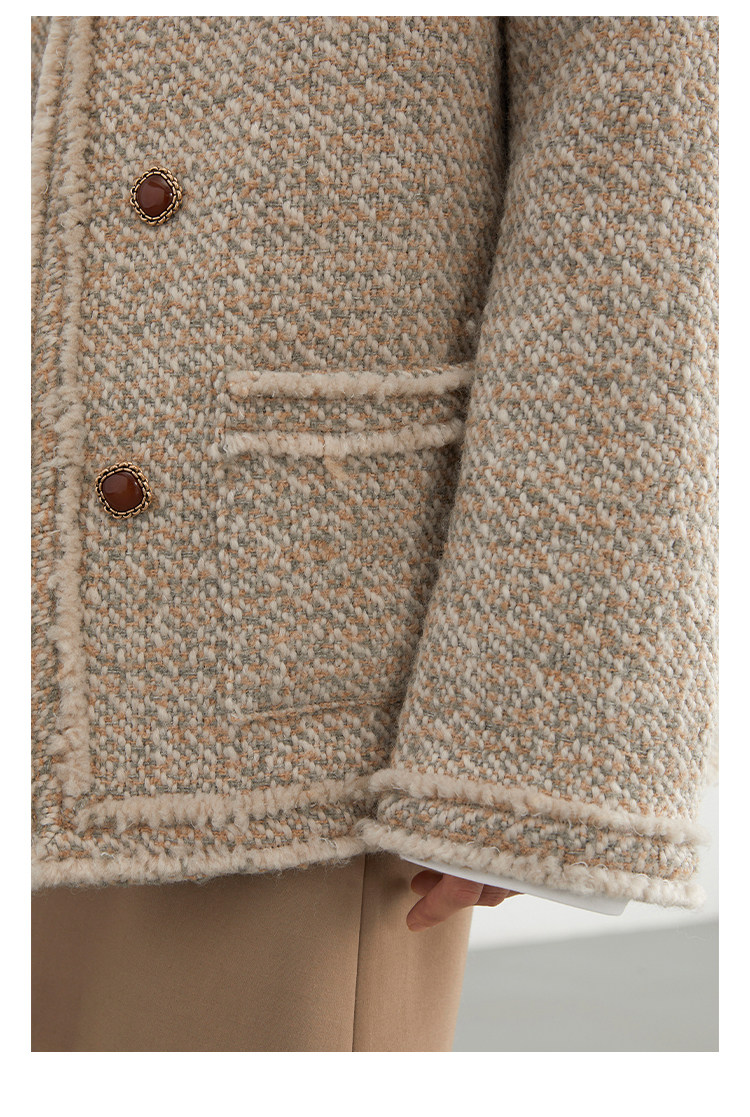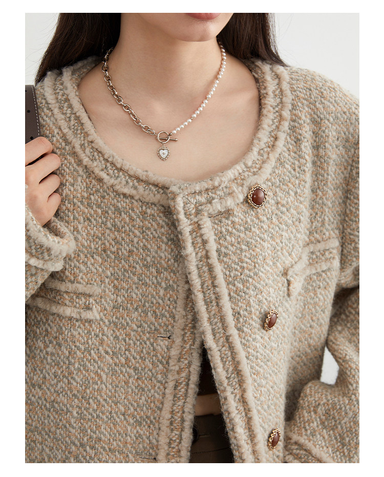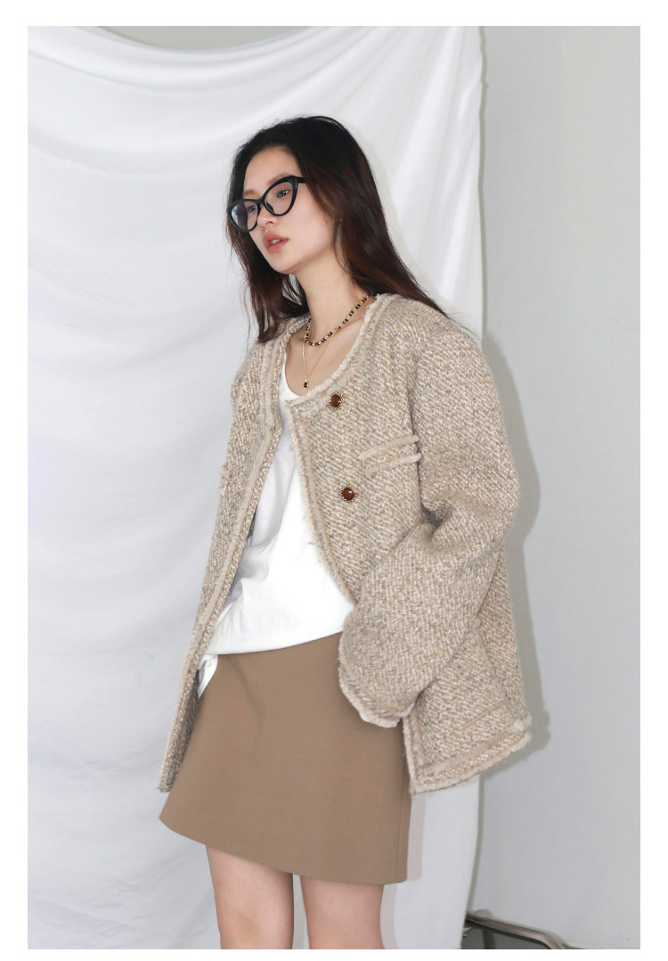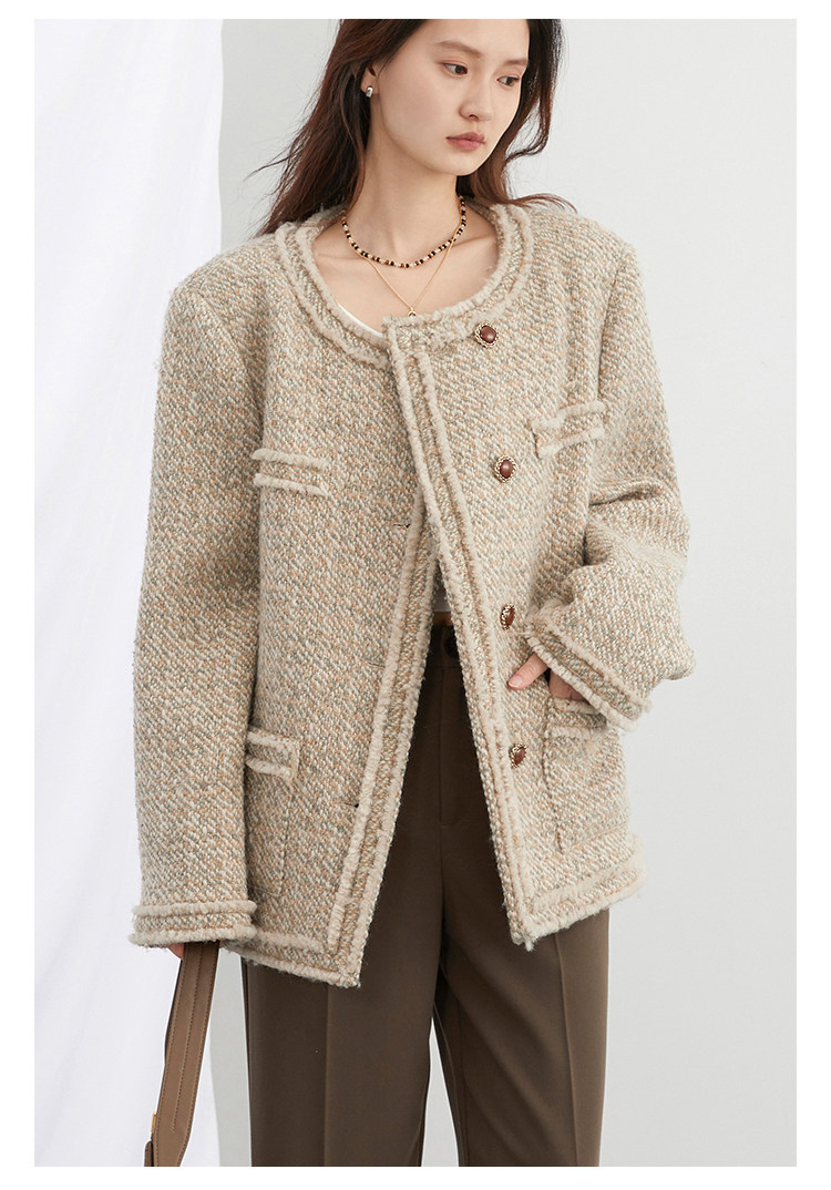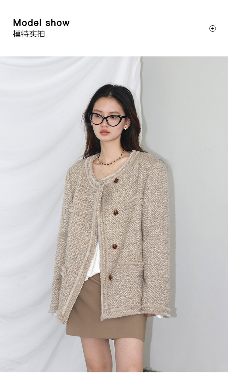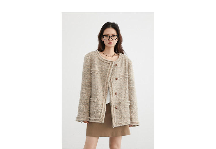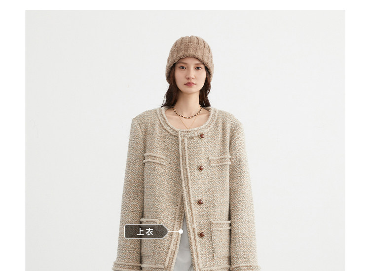 Силуэт в форме коробки джингдиан Большой круглый дизайн шеи, что делает темперамент хорошим, гармоничный внутренний слой не разборчивый Наклонная планка новая и уникальная по форме, ниша и привлекательная ~ Плековые колодки добавляются к плечам, которые являются четкими и естественными, создавая ощущение дежавю. Граница, шейки, фронта, подол и карманные края все вручную. Главка украшена кнопками агата с золотыми краями, что имеет сильное чувство детализации в тяжелой промышленности ~
