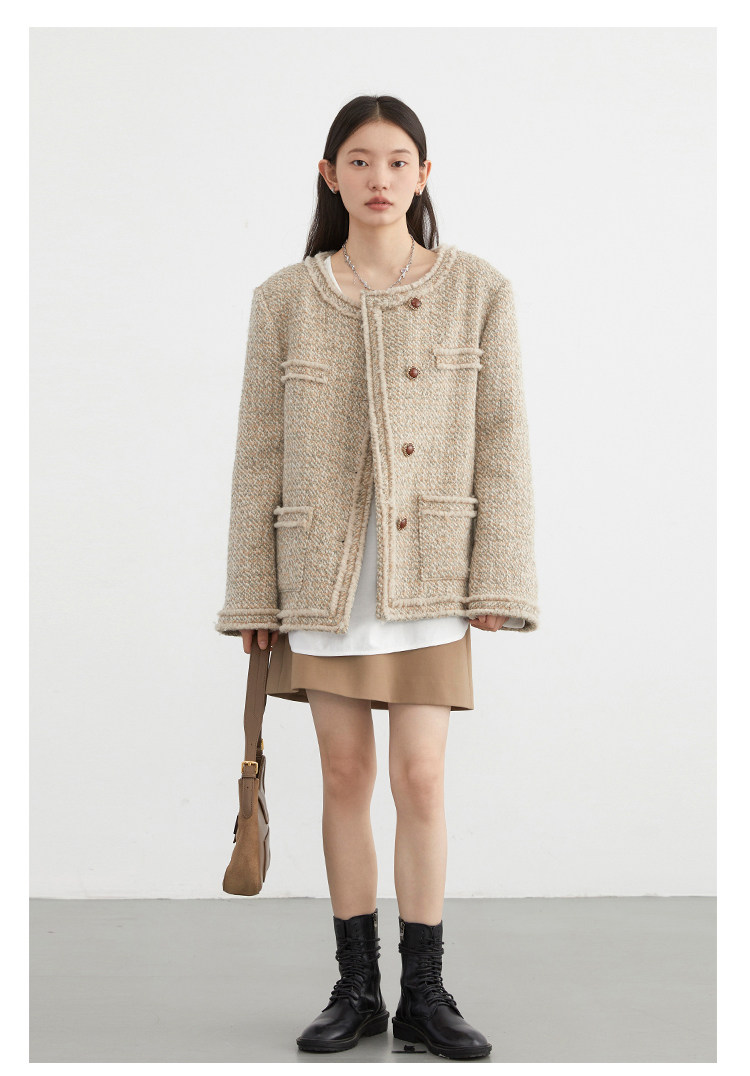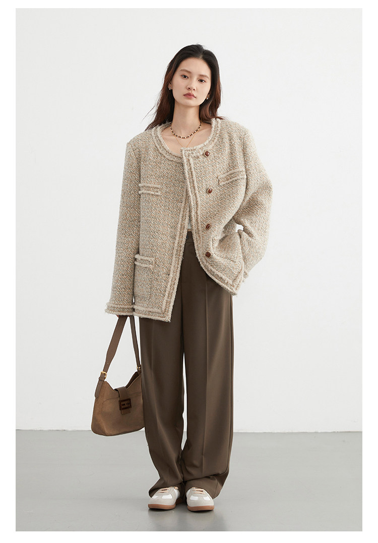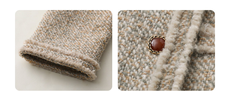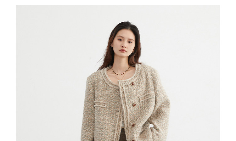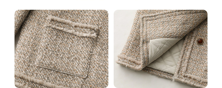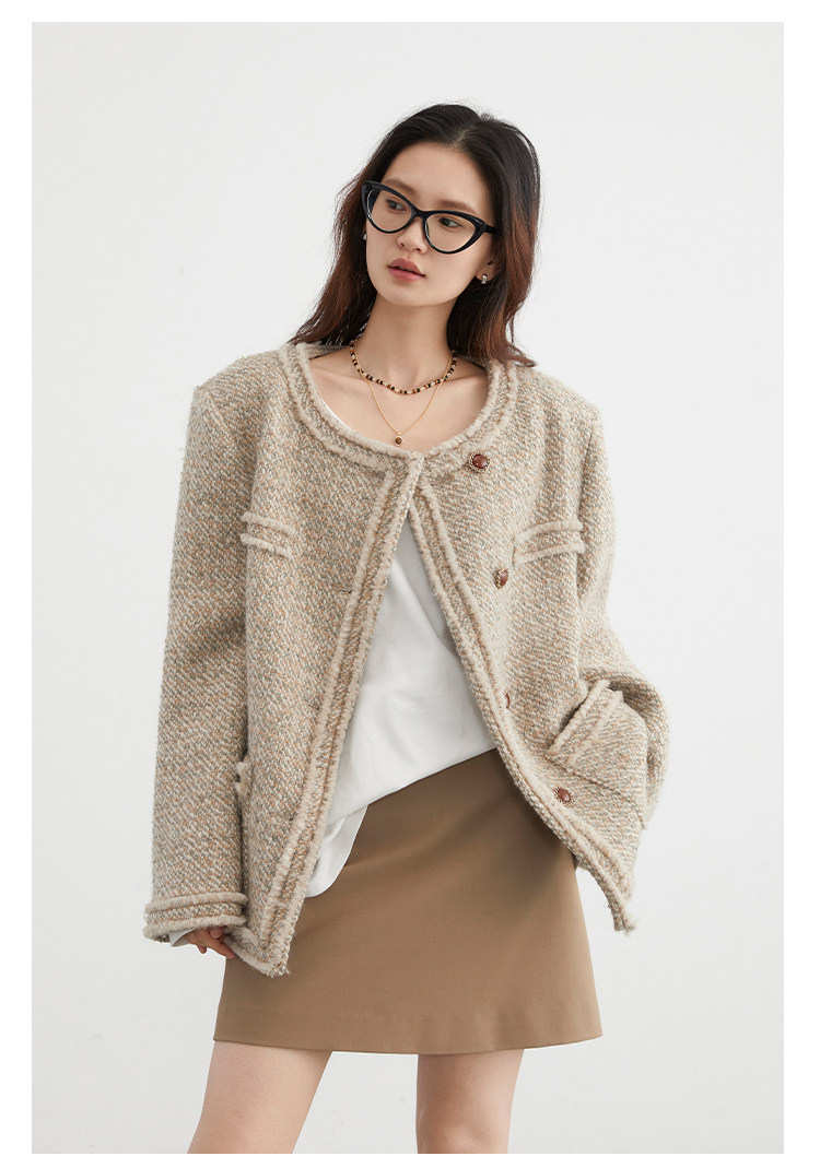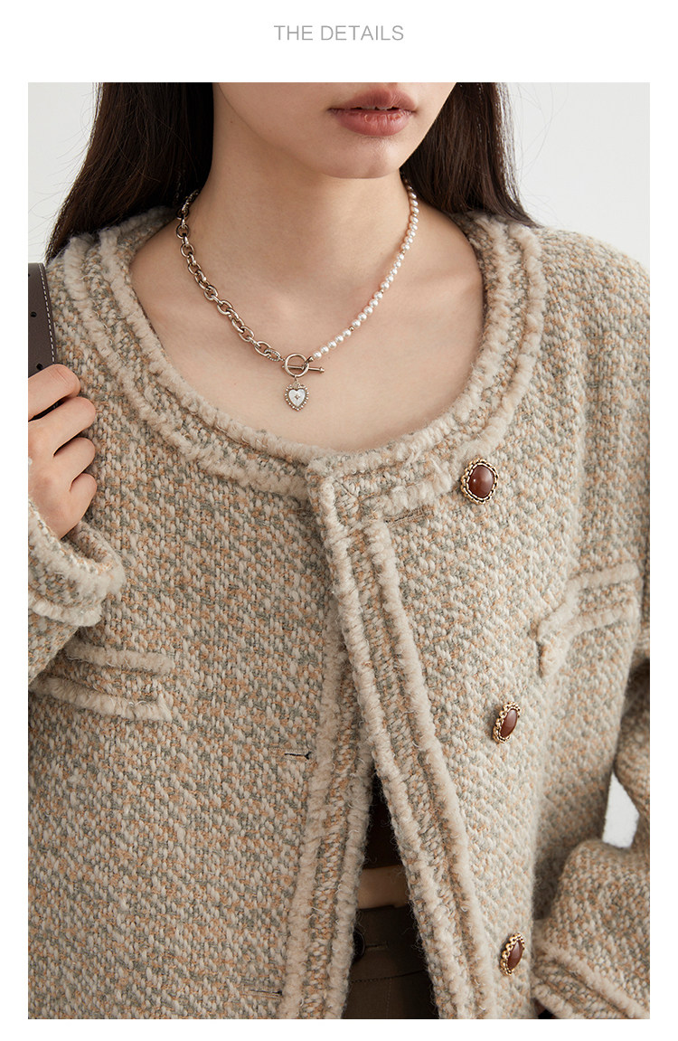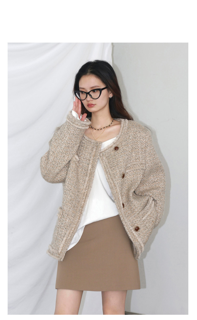 Силуэт в форме коробки джингдиан Большой круглый дизайн шеи, что делает темперамент хорошим, гармоничный внутренний слой не разборчивый Наклонная планка новая и уникальная по форме, ниша и привлекательная ~ Плековые колодки добавляются к плечам, которые являются четкими и естественными, создавая ощущение дежавю. Граница, шейки, фронта, подол и карманные края все вручную. Главка украшена кнопками агата с золотыми краями, что имеет сильное чувство детализации в тяжелой промышленности ~