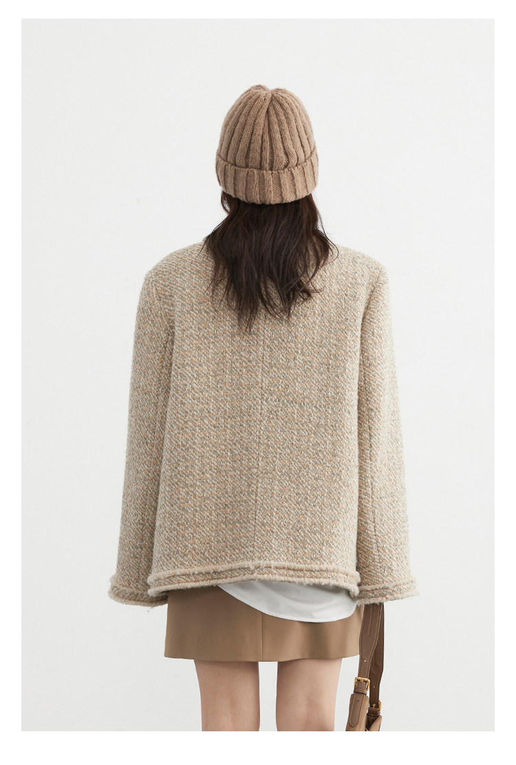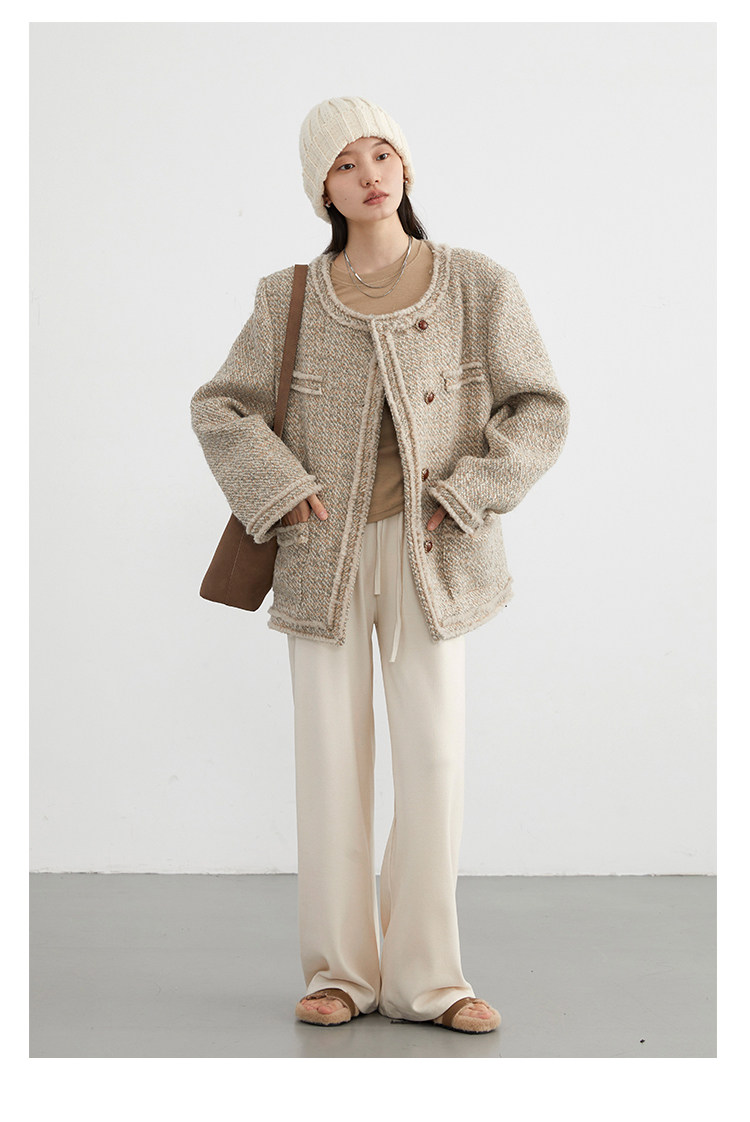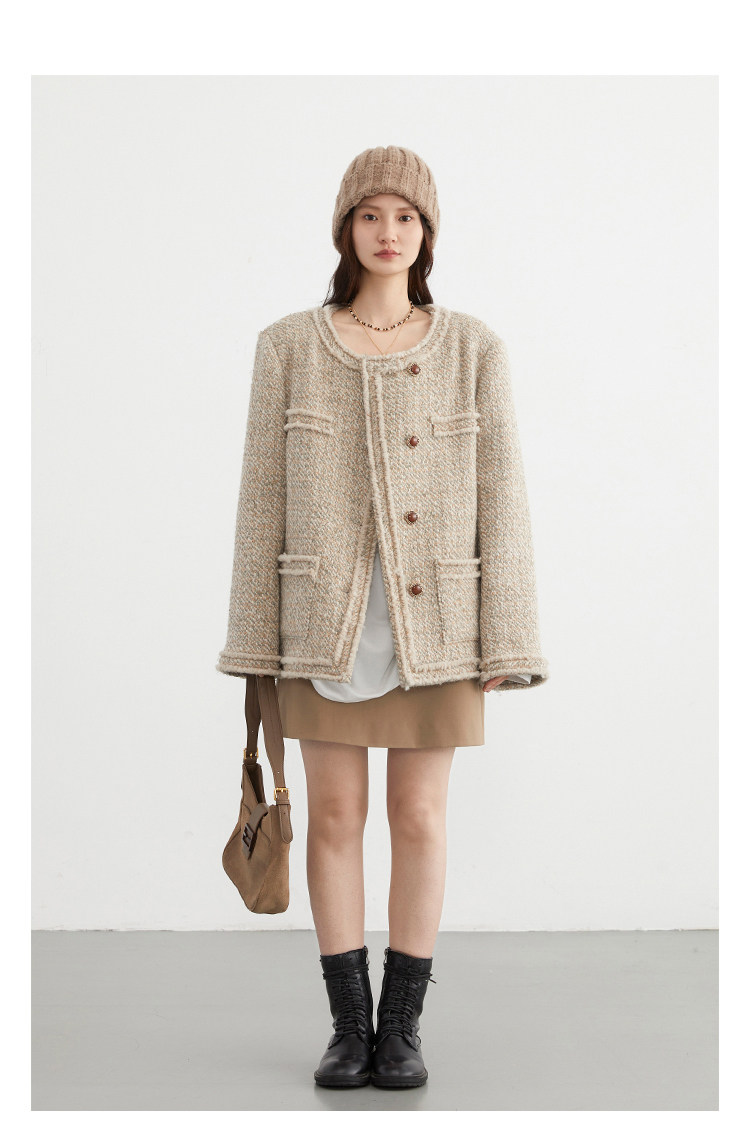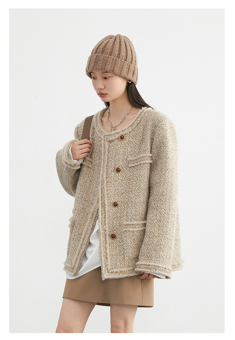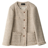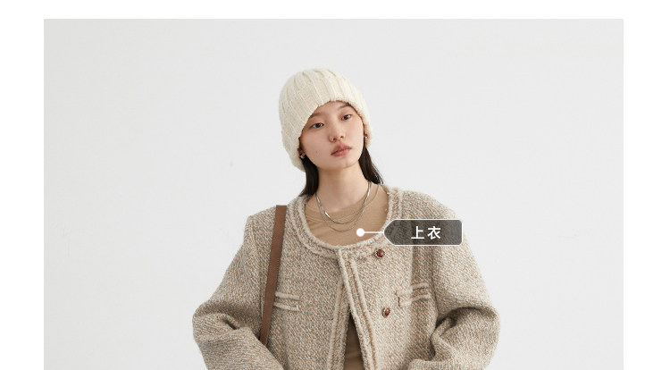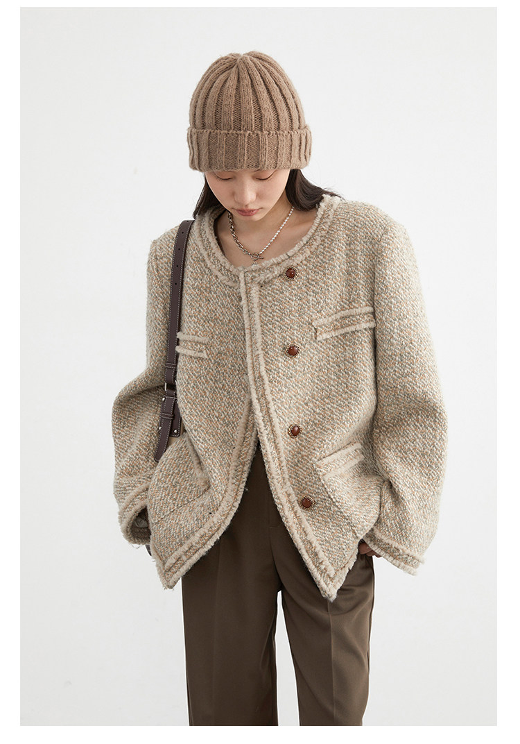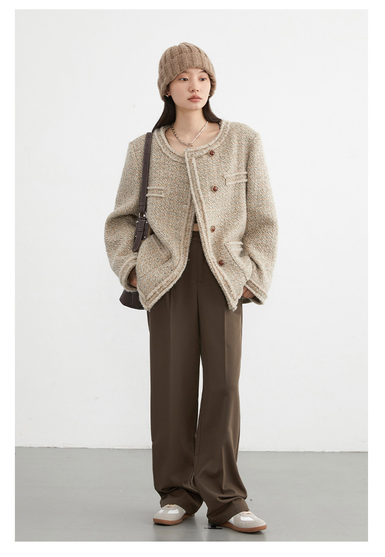 Силуэт в форме коробки джингдиан Большой круглый дизайн шеи, что делает темперамент хорошим, гармоничный внутренний слой не разборчивый Наклонная планка новая и уникальная по форме, ниша и привлекательная ~ Плековые колодки добавляются к плечам, которые являются четкими и естественными, создавая ощущение дежавю. Граница, шейки, фронта, подол и карманные края все вручную. Главка украшена кнопками агата с золотыми краями, что имеет сильное чувство детализации в тяжелой промышленности ~