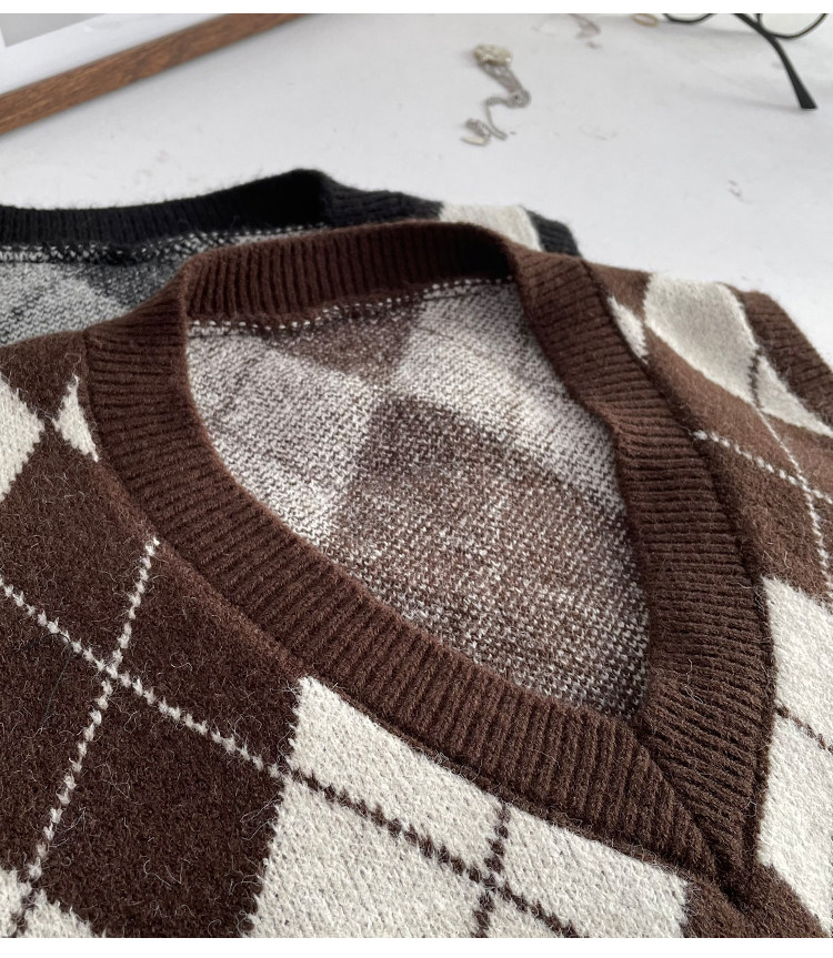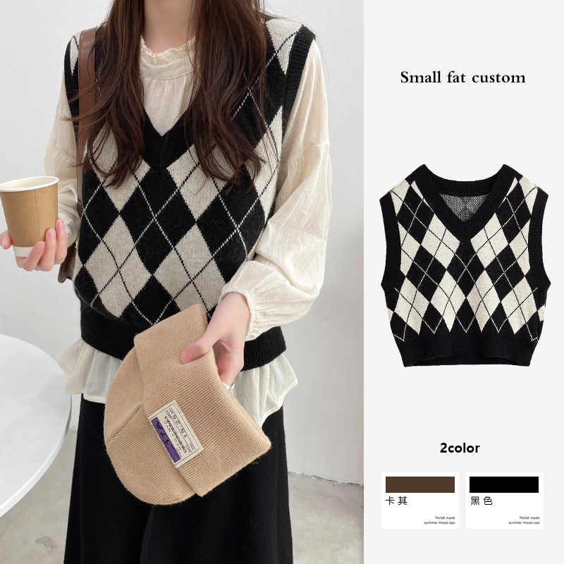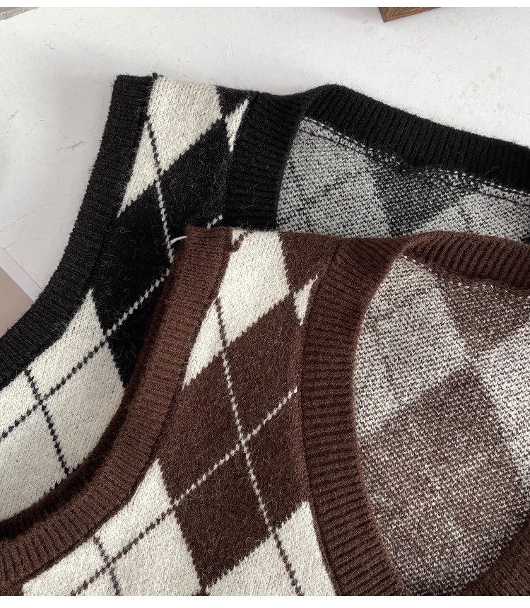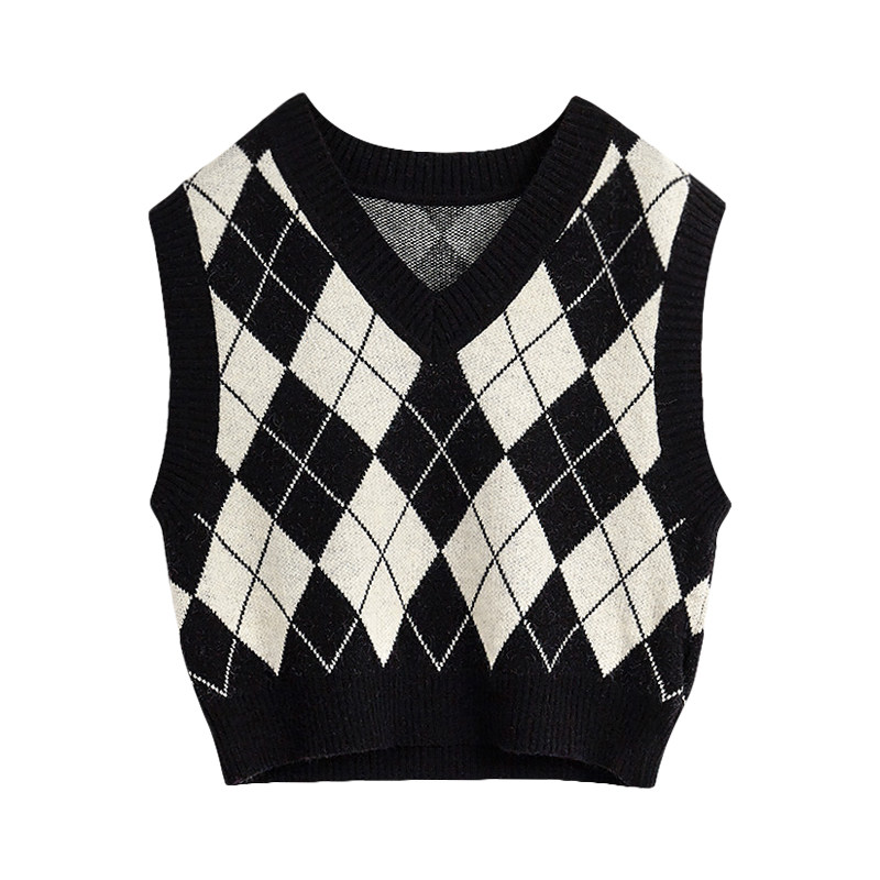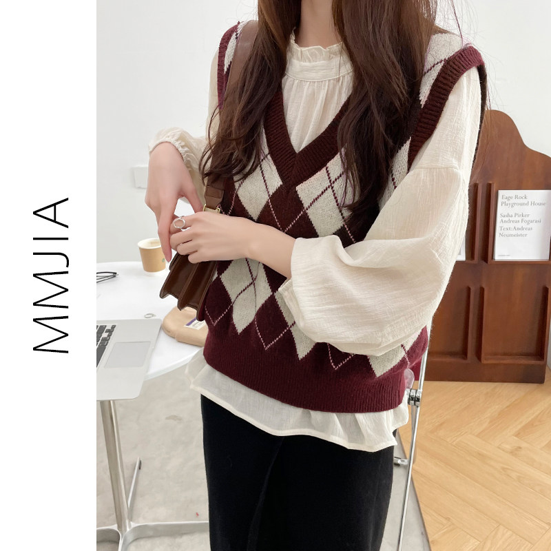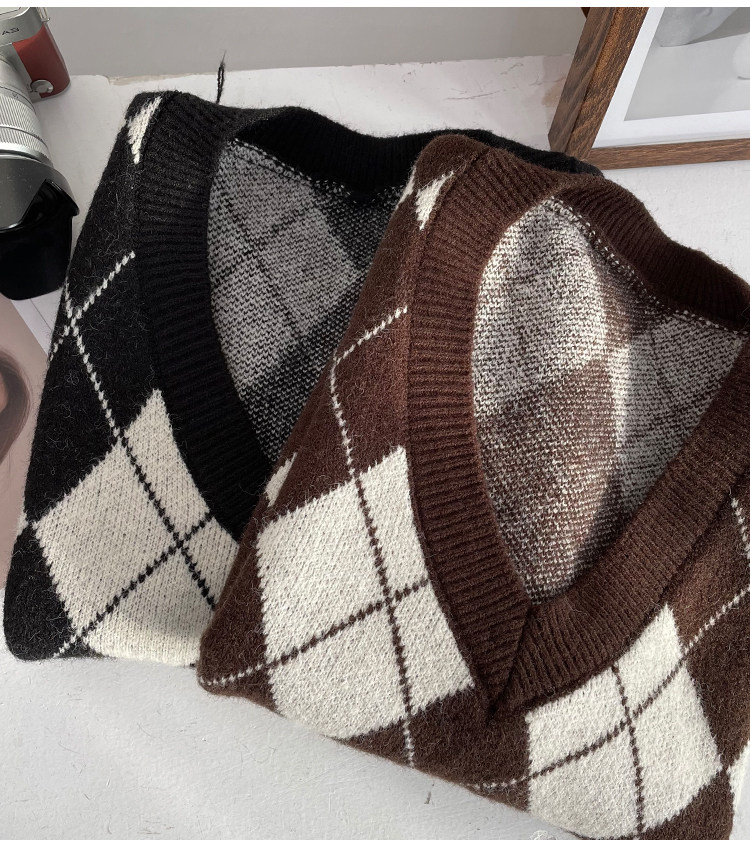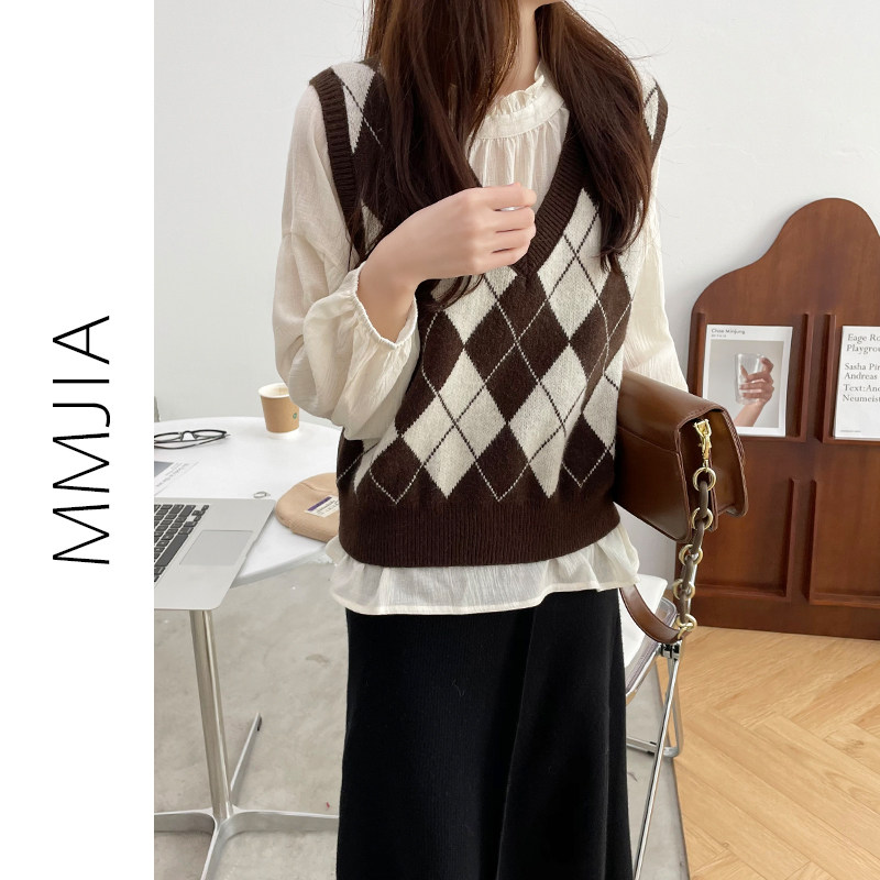 Ретро трикотажный весенний осенний жилет с ромбовидным узором, свитер без рукавов, 2021 года, свободный крой, V-образный вырез