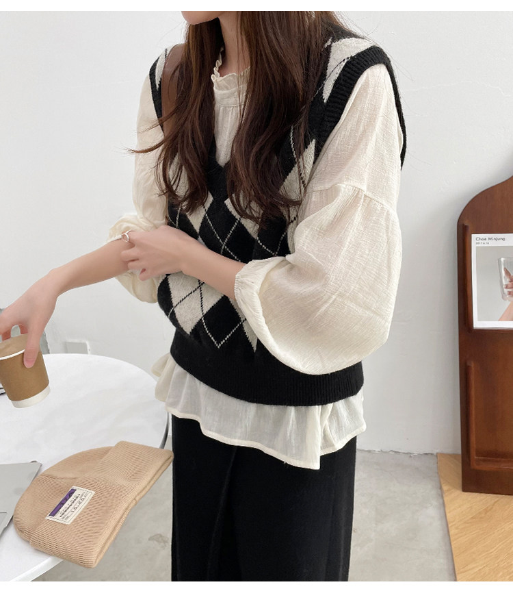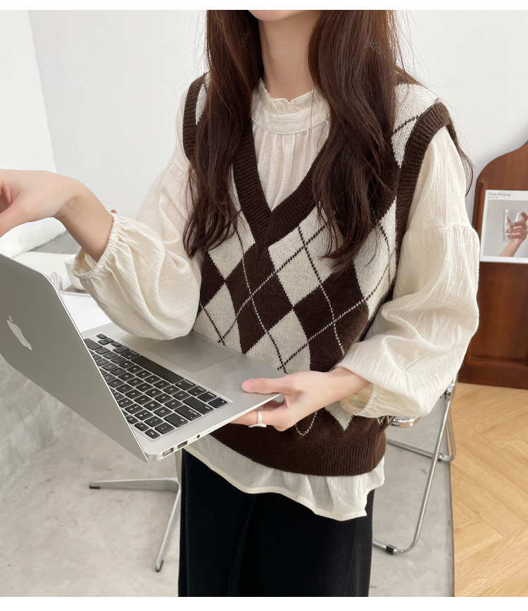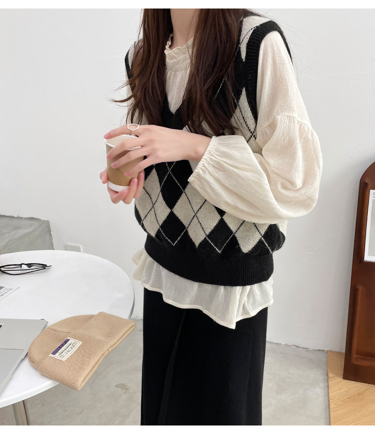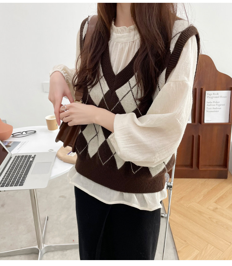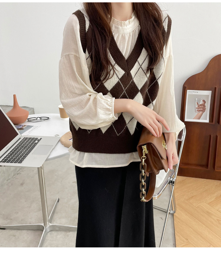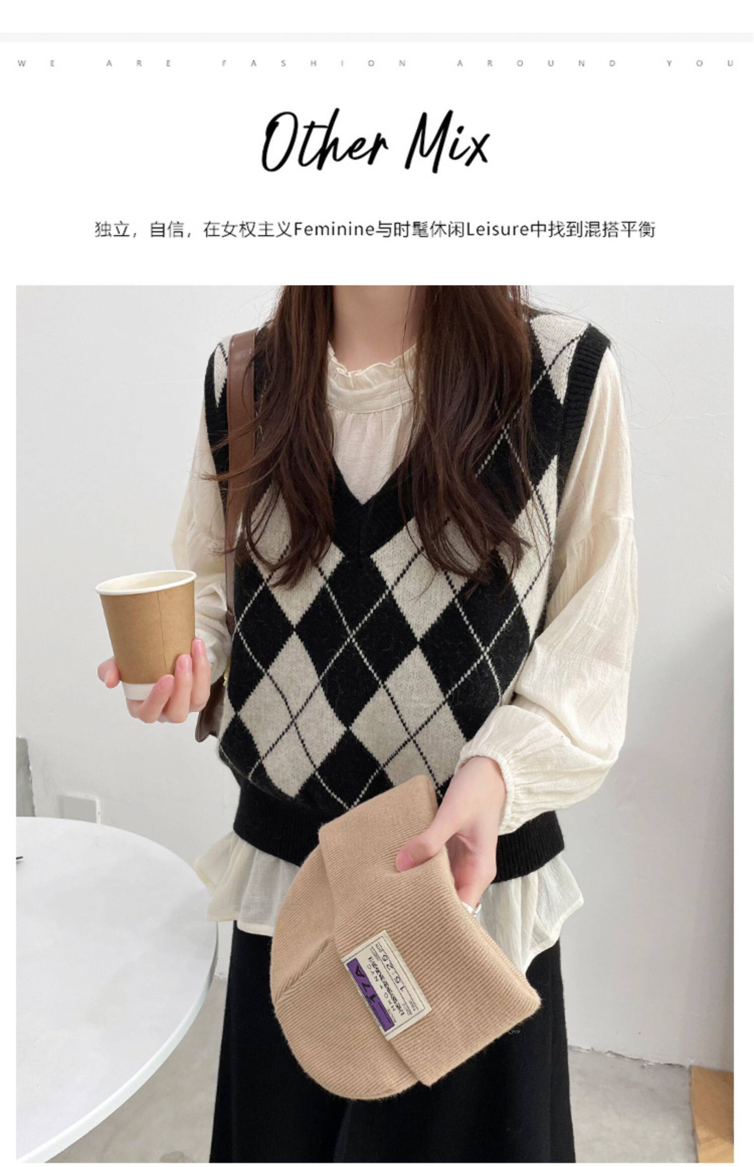Ретро трикотажный весенний осенний жилет с ромбовидным узором, свитер без рукавов, 2021 года, свободный крой, V-образный вырез