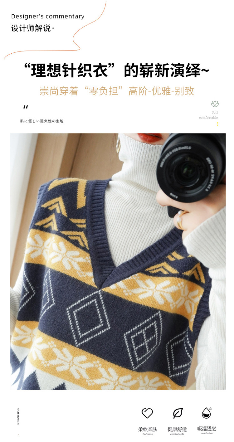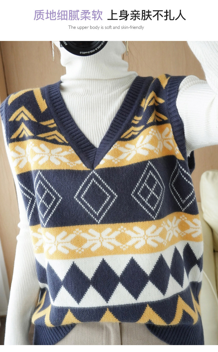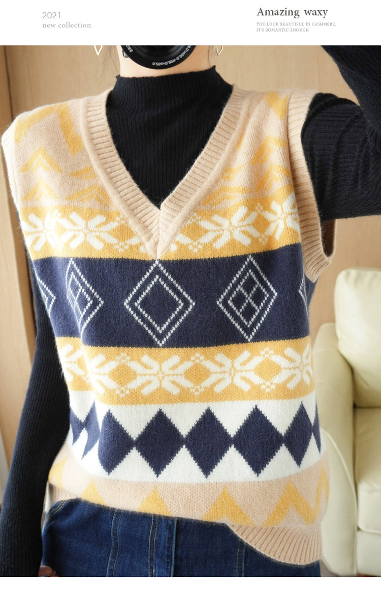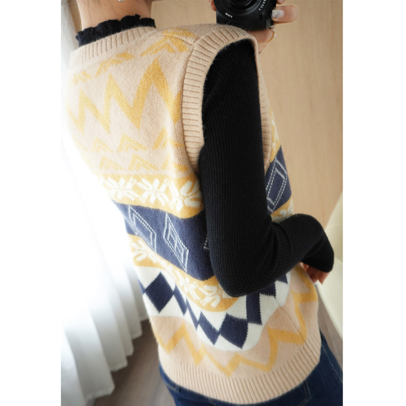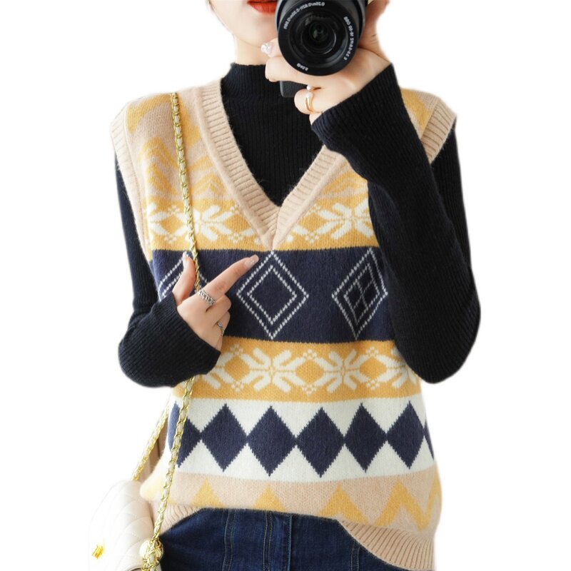 Шерстяной жилет, куртка без рукавов, кашемировый ретро свитер для отдыха, V-образный вырез, свободный крой