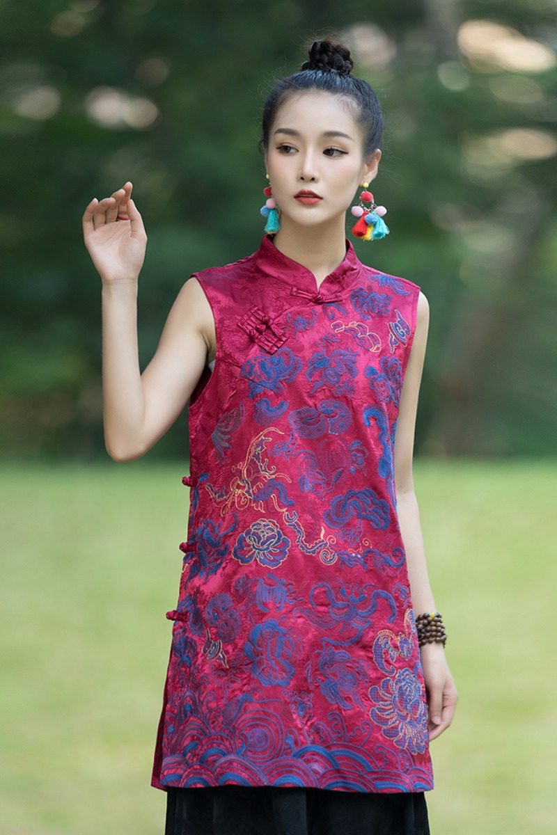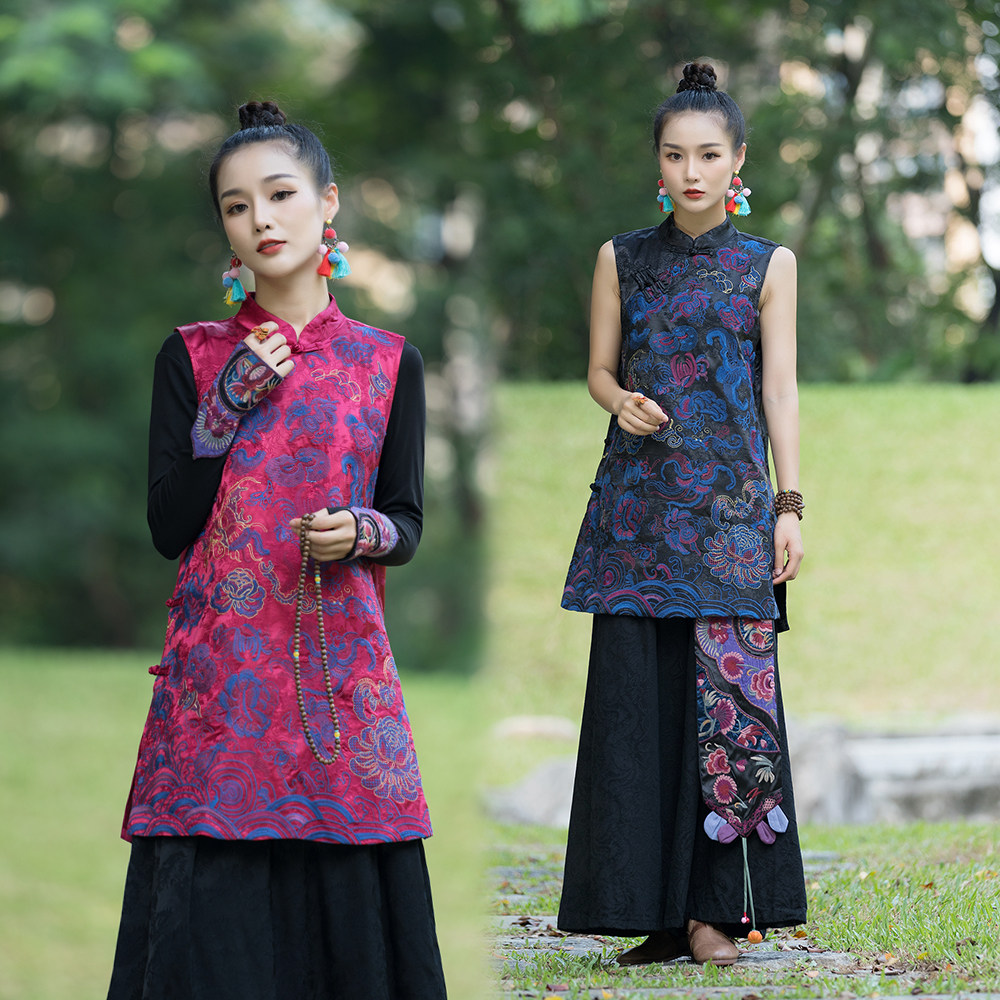 Этническое ципао, длинный жилет, куртка, осеннее, этнический стиль, средней длины, китайский стиль, с вышивкой