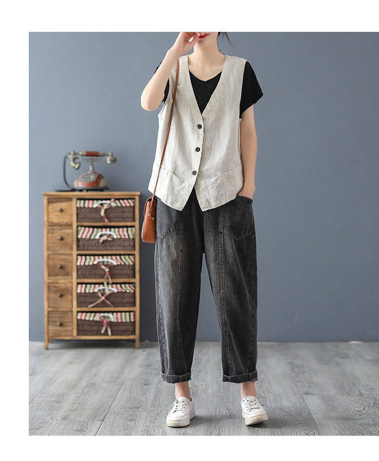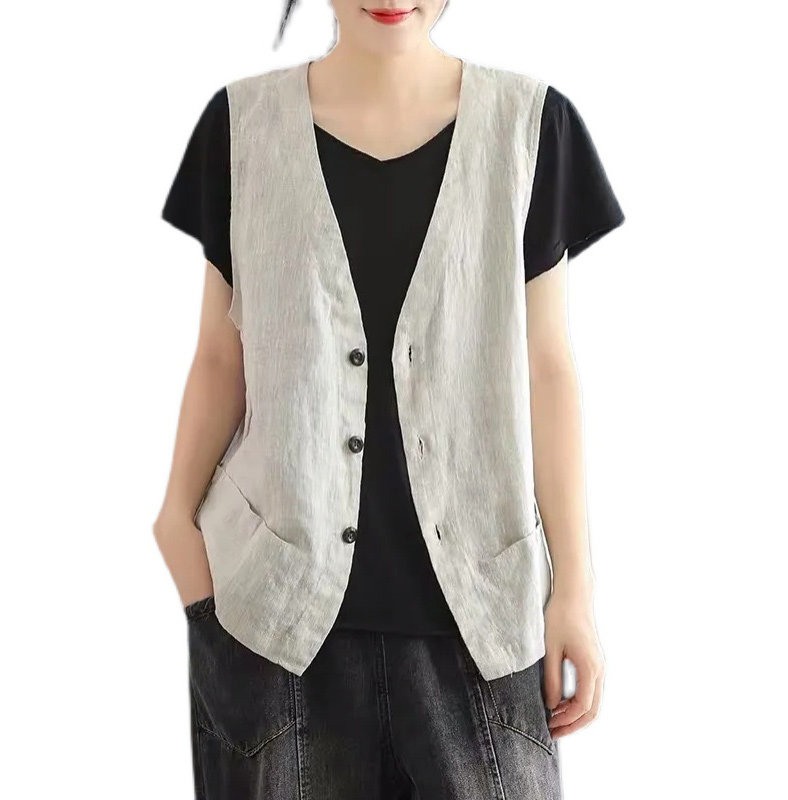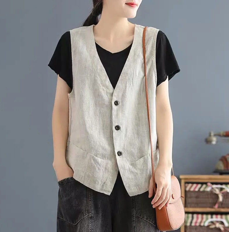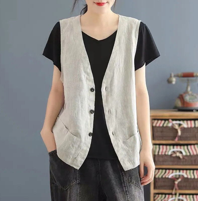 Японский жилет, легкая и тонкая майка топ без рукавов, V-образный вырез, из хлопка и льна