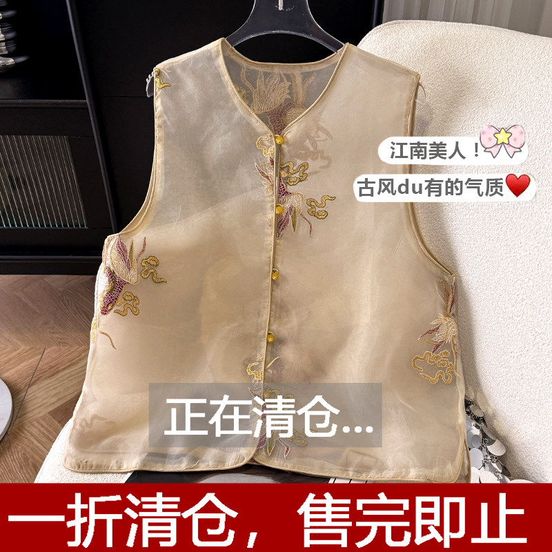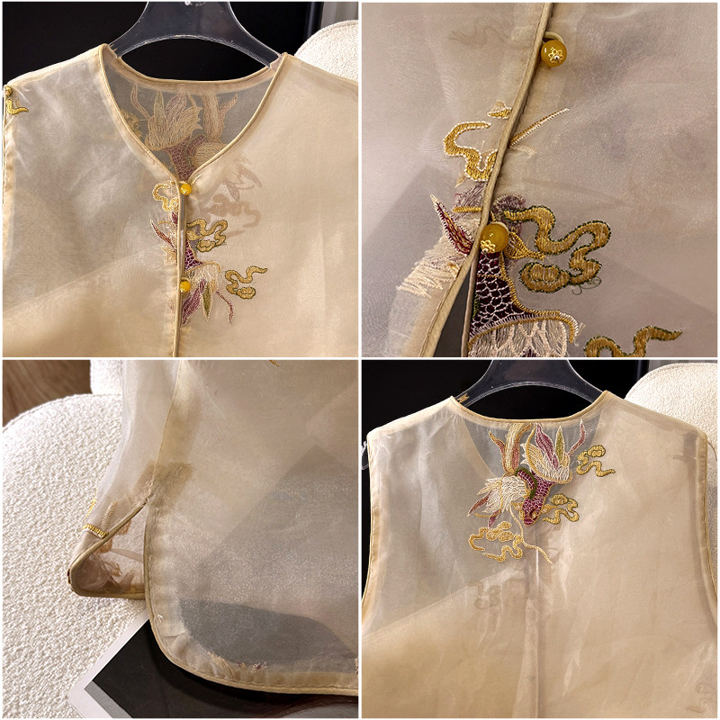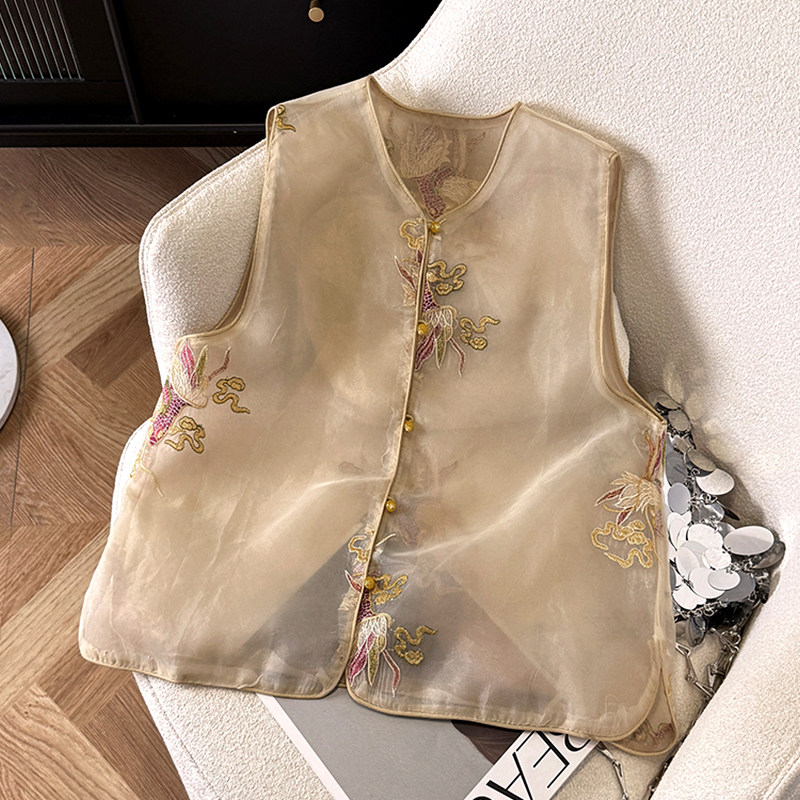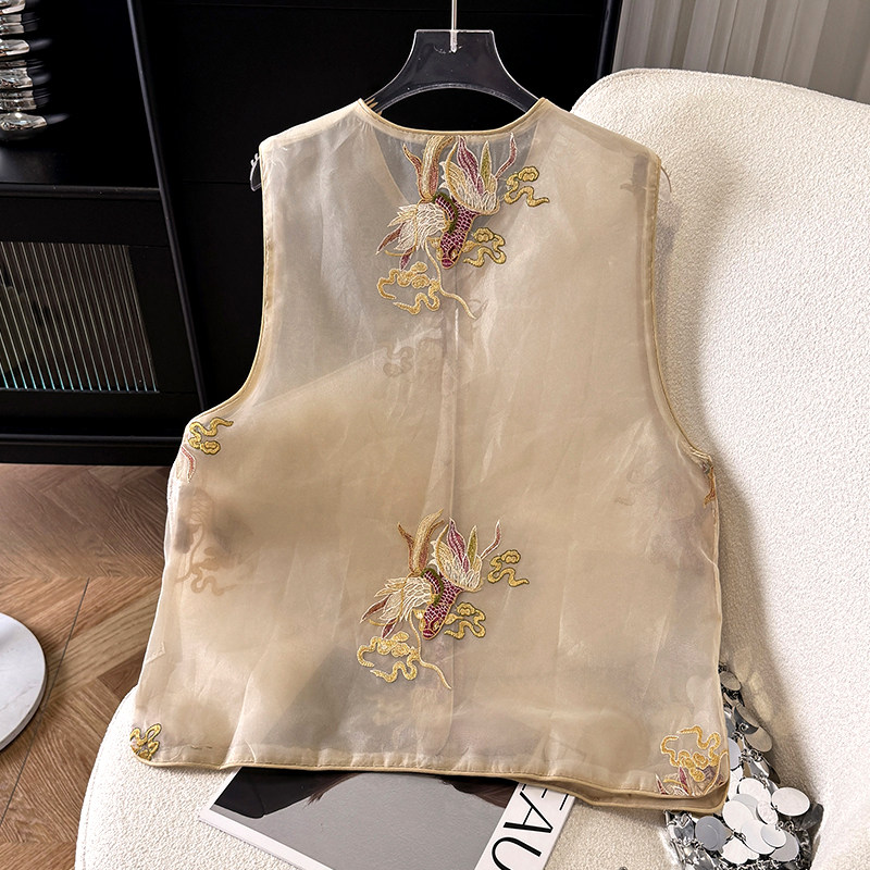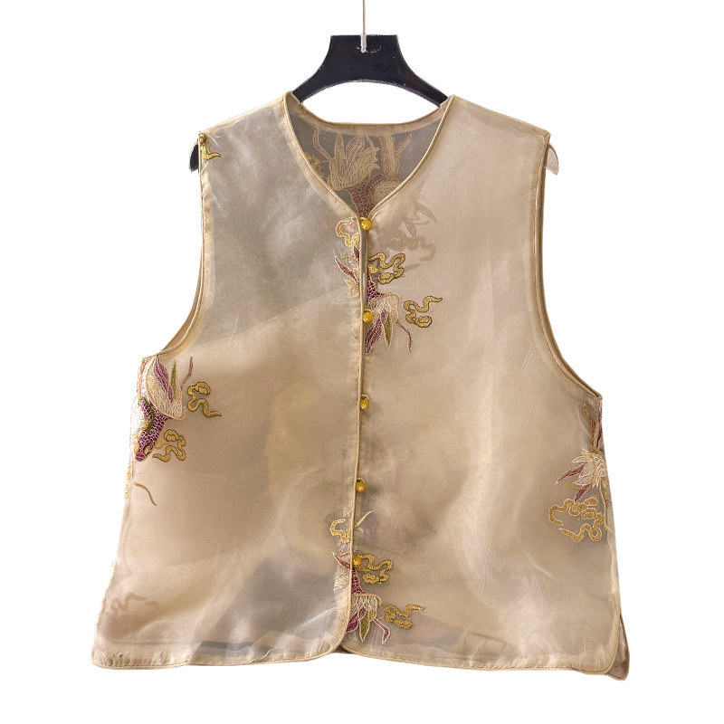 Летний тонкий жилет, шелковая майка топ, китайский стиль, с вышивкой
