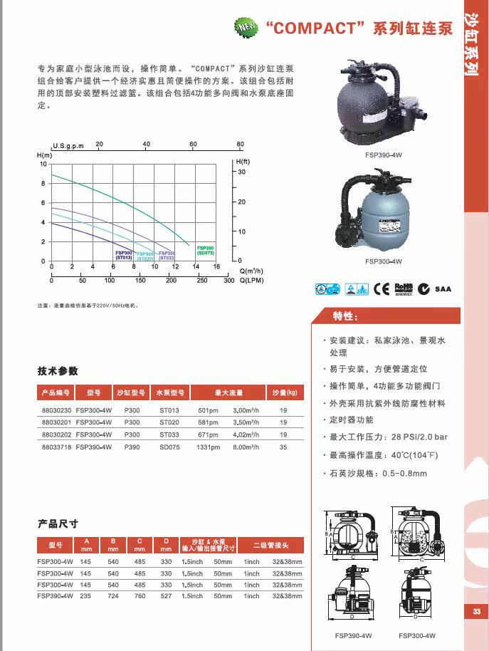 [专为家庭小型泳池而设,操作简单,]"COMPACT"[系列沙缸连泵组合给客户提供一个经济实惠且简便操作的方案。该组合包括耐用的顶部安装塑料过滤篮,该组合包括4功能多向阀和水泵底座固定。]