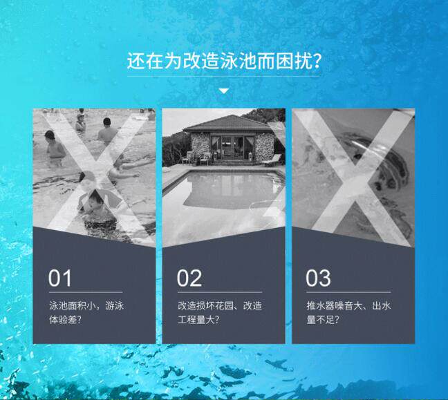 Общий размер безграничного блока бассейна составляет 6 метров и шириной 3 метра, а некоторые продукты также имеют SPA -устройства.Небольшая площадь территории более удобна и ниже традиционной формы встроенного бассейна, что является основным преимуществом его основного преимущества, и его основной функцией является оборудование пропеллера по потоку слоя.