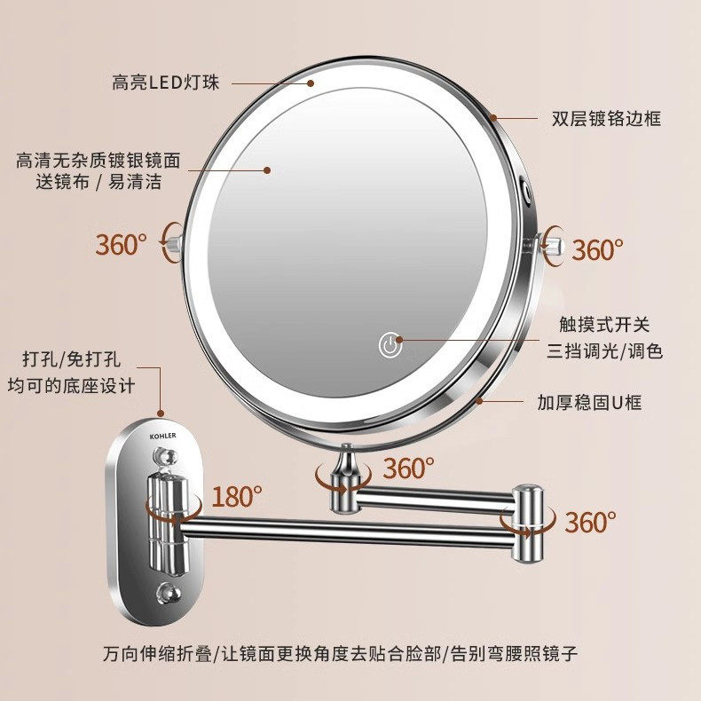 Стена бренда -светодиодный светодиодный светодиодный зеркальный зеркальный зеркал ванная комната круглый макияж зеркал отель бесплатно ударить телескопический склад