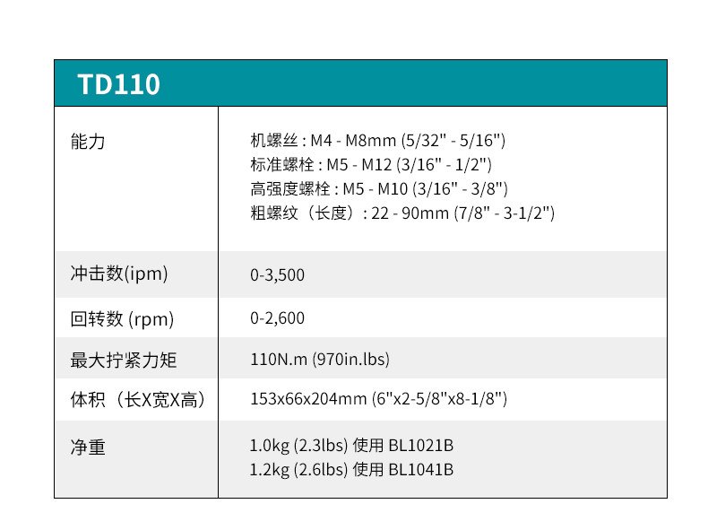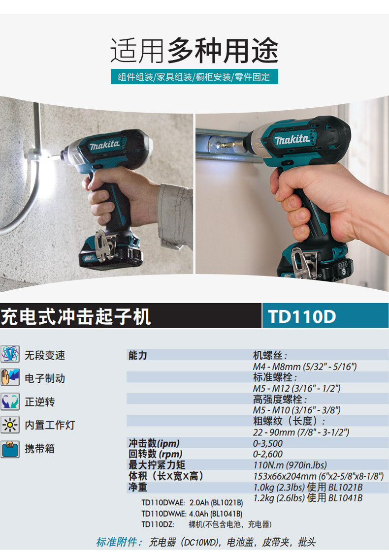 | Цвет: | TD110DZ (за исключением батареи, зарядного устройства), TD110DSAE (2,0 батарея две питания и одна питание), TD10DSME (4,0 батарея и одноэтажная зарядка) |