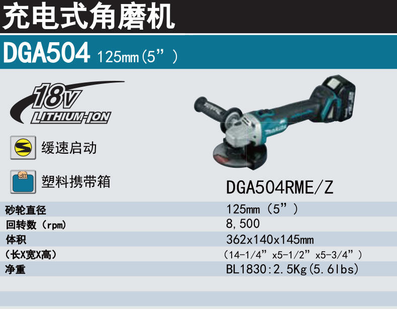Makita Makada Зарядка угловая шлифовальная машина DGA504SFJ/506 Электрическая бесщеточная литиевая батарея металлическая металлическая режущая