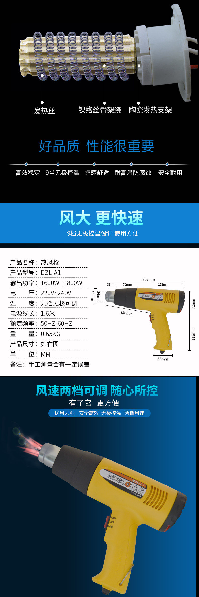 Высокая мощность 1800 Вт Регулируемая промышленная электрическая фен.