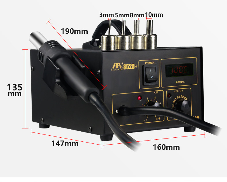 | Цвет: | 852d+черный, Нагревательный элемент 852D+, Шида ручная жестяная всасывающая посуда, Ручной баллон с горячим воздухом с цифровым дисплеем |