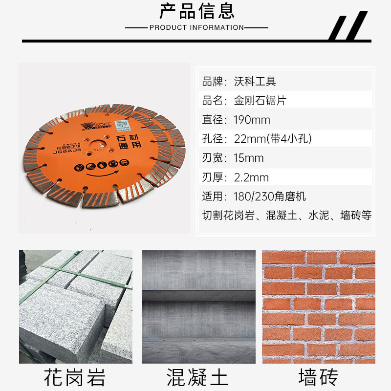 Woko 190 Резгочная таблетка алмазной пилы таблетка гранитная мраморная бетонная резка таблетка угловой шлифовальный станок лезвие