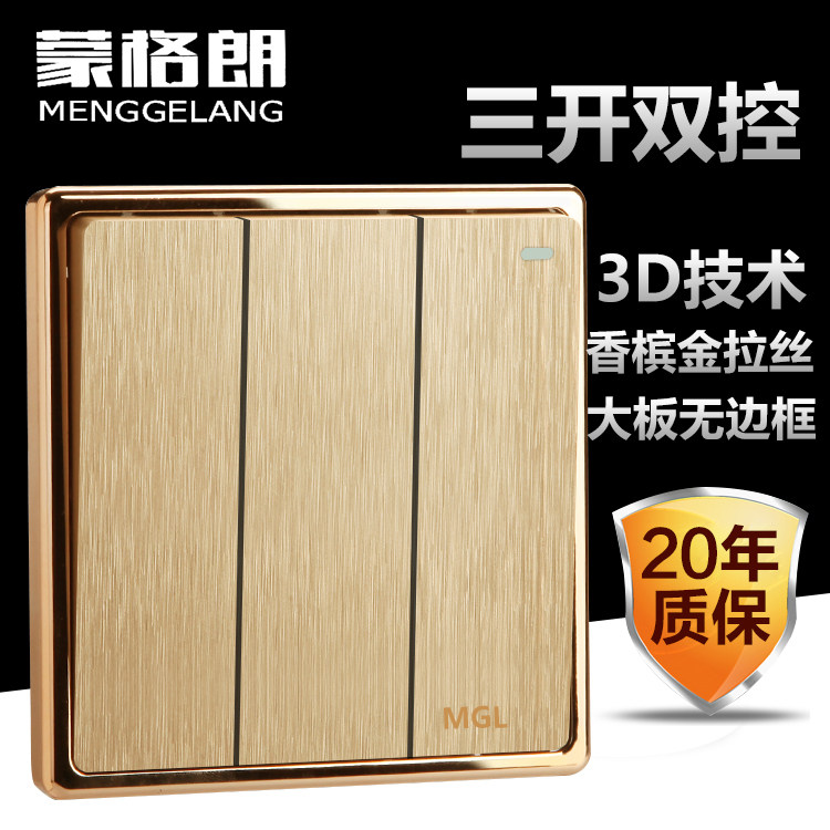 3D рисунок шампанского золота с тремя открывающимися двойным выключателем трехсекционного настенного переключателя панель 86 Трехуровневое трех -открытое двойное управление