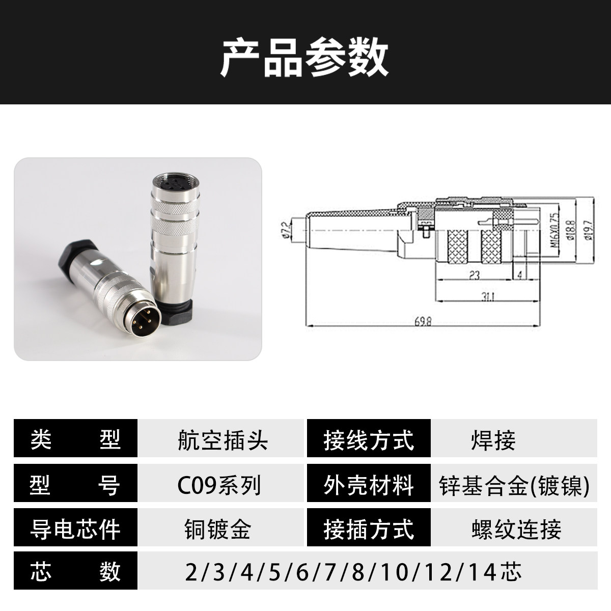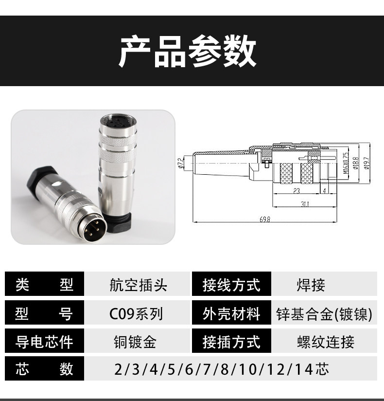 C09 2/3/4/56 78101214 Core M16 Металлическая экранированная водонепроницаемая коннектер