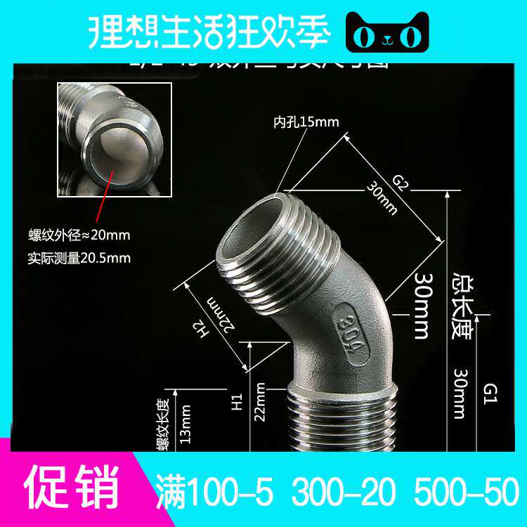 [优] 304 Нестандартная сталь 4 -точка двойной проволоки колена 45 Угол Косой локоть сгущенным соединением аксессуары для водопроводной трубы 6 точек 1 дюйм 2