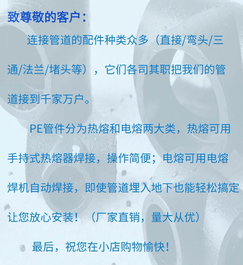 Новые ингредиенты PE Water Pipe 110 Dock 90 градусов локоть 45 градусов 22,5 градусов 160, 200 равный диаметр 315 суставов