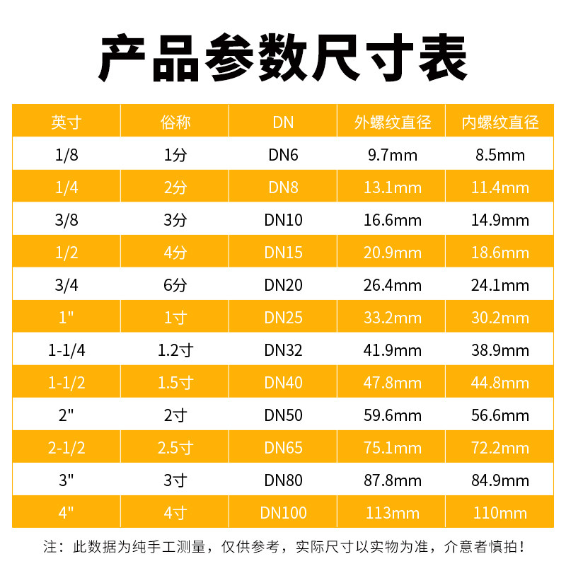 | Цвет: | 1 точка = 1/8 = DN6, 2 балла = 1/4 = DN8, 3 балла = 3/8 = DN10, 4 балла = 1/2 = DN15, 6 баллов = 3/4 = DN20, 1 дюйм = 1 "= DN25, 1,2 дюйма = 11/4 = DN32, 1,5 дюйма = 11/2 = DN40, 2 дюйма = 2 "= DN50, 2,5 дюйма = 21/2 = DN65, 3 дюйма = 3 "= DN80, 4 дюйма = 4 "= DN100 |