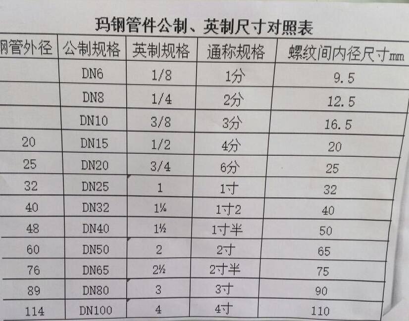 [玛钢管件一段时间以来,由于各地口径表述不同,经常有客户拍错尺寸,dn15管件口径是20mm,dn20管件口径是25mm,dn25口径是32mm,具体参照下表,请客户认真选择尺寸,祝大家购物愉快,本公司货源充足,量大优惠,欢迎联系旺旺或电话13196487883]