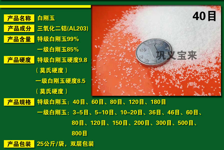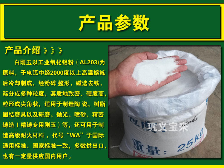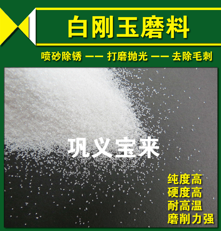 Белый цвет бай -гангю, высокая твердость, слегка прочность, высокая чистота, высокая защелка, сильное измельчение, небольшое тепло, высокая эффективность, кислота -калка, коррозия, высокая температурная устойчивость, хорошая термостабильность и т. Д. Материалы и операции на песчаной обработке.