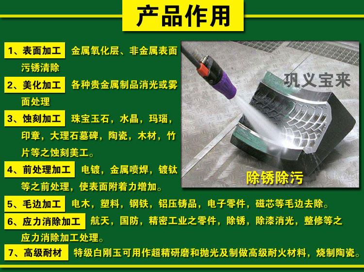 Bai Gangyu используется в качестве абразивного песчаного бласта, подходящего для подходящегоВлажный, сухой или спрей -песок, можно использовать в качестве поверхностной обработки, обработки благоустройства, обработки травлений, обработки шерсти и т. Д.одеялоШироко применимо к полировке, удалению ржавчины, окислению кожи, повышенным покрытием, покрытием адгезии для аппаратного оборудования,SandblastПоверхность белая без каких -либо примесей, чтобы не чистить проблемы.