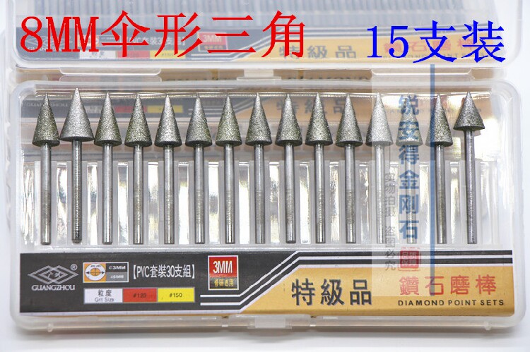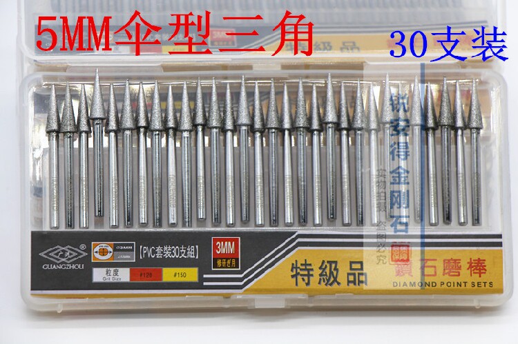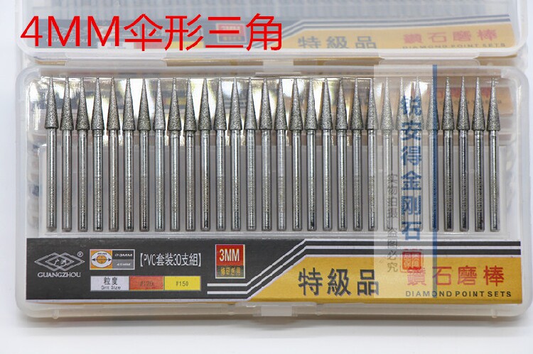 Иглы ваджраяны можно разделить на: цилиндрический, зонтичный, сферический, цилиндрический цилиндрический, форма чипа, инвертированный трапециэидальный, заостренный и другой.Он может быть установлен на электрической шлифовальной машине, скульпторе и пневматической рубеже.В основном он используется в резьбе, бурении, полировке и т. Д. Керамики, стекла, камня, нефритового изумрудного агата и других материалов.Лучше добавить воду, Может увеличить жизнь резкости и измельчения игл.