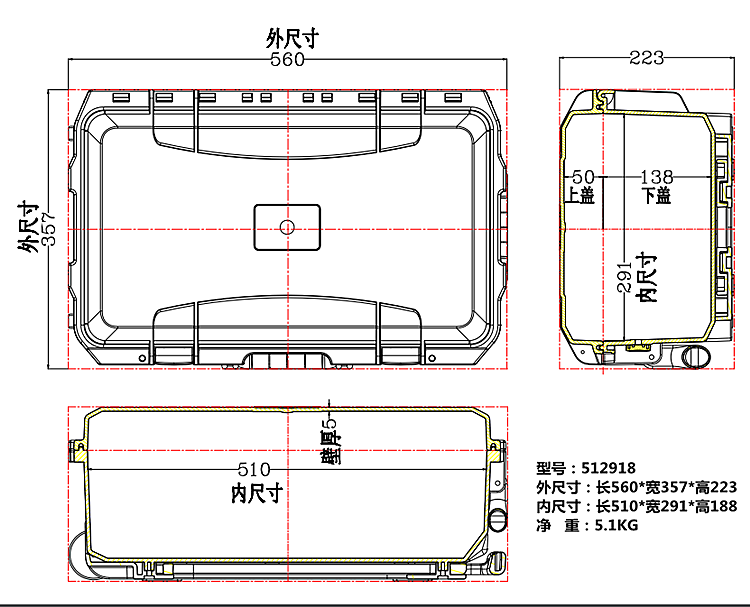 Внутренний размер (мм):510*Ширина 291*Высота 188 (верхняя крышка 50, нижняя крышка 138)