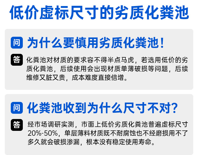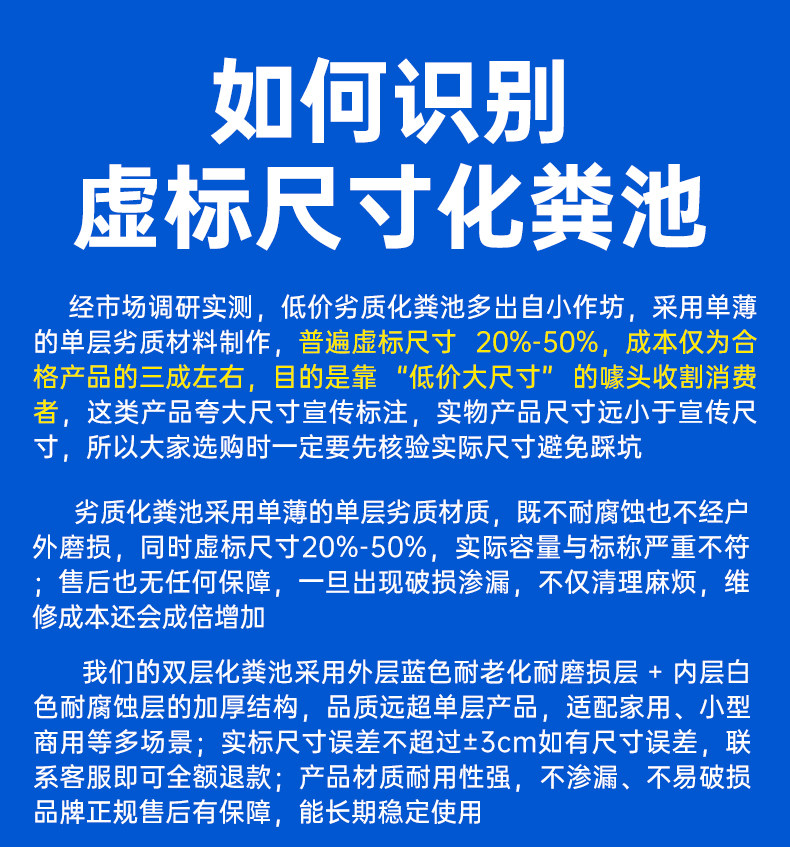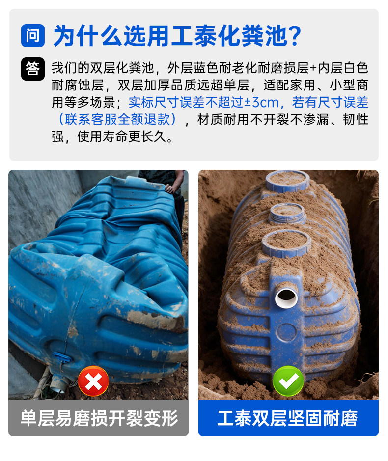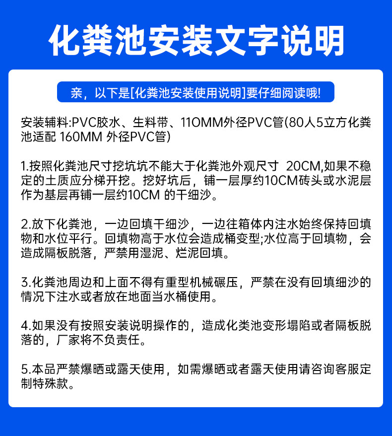 ① Септик имеет большие размеры, а затраты на логистику и транспортировку высоки. Пожалуйста, внимательно подумайте перед размещением заказа, если есть необходимость. После отправки покупатель будет нести ответственность за оплату обратной доставки, если нет проблем с качеством. Этот продукт доставляется компаниями SF Express или Deppon Express. Если ваш адрес доставки находится в слепой зоне SF Express или Deppon Express, вам нужно будет забрать его самостоятельно.