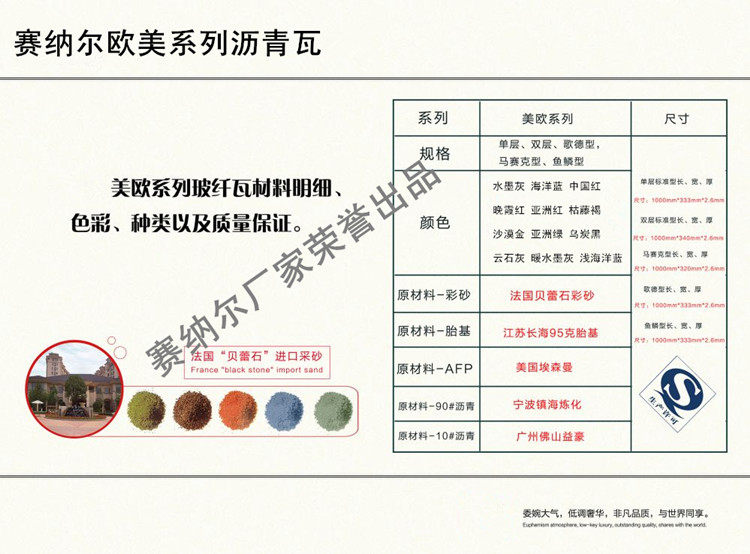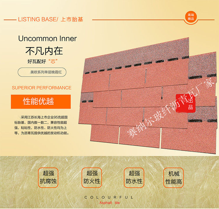 Асфальтовая черепица Senal из стекловолокна является обозначенной единицей асфальтовой черепицы национального стандарта и строго соответствует национальному стандарту: GB/T20474-2006. Прошел «частичную проверку национальными авторитетными учреждениями» со стабильным качеством, не выцветанием и стабильной производительностью.На однослойную плитку предоставляется гарантия 30 лет, на двухслойную – 50 лет.Производитель обещает компенсировать любые выцветания или шлифовку.