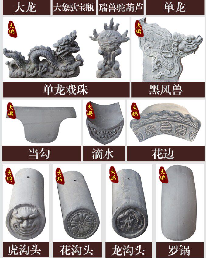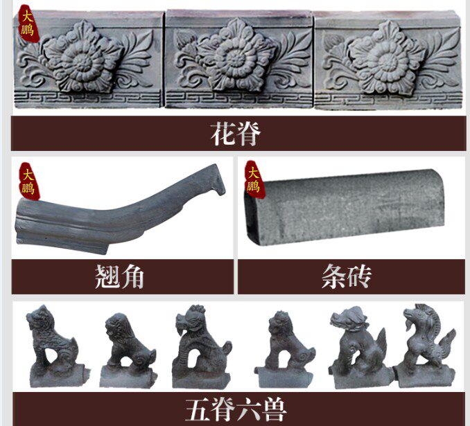 Зеленый кирпич, зеленая плитка, глазированная плитка, пять позвоночников и шесть зверей и различные аксессуары.