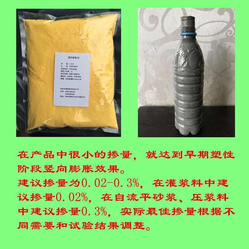 2. Соответствующее количество пластического расширения агента в материале составляет 0,03%—0,3%.Рекомендуется, чтобы количество смешивания в заткнувшемся материале составляло 0,03%, то есть 0,3 кг агента расширения пластика добавляли к 1 -детоновому материалу.Рекомендуется смешать 0,2-0,3%в материалах с плавным раствором и затиркой, то есть добавить 2-3 кг 1 тонны материала.В фактическом использовании количество допинга должно быть скорректировано в соответствии с результатами испытаний.