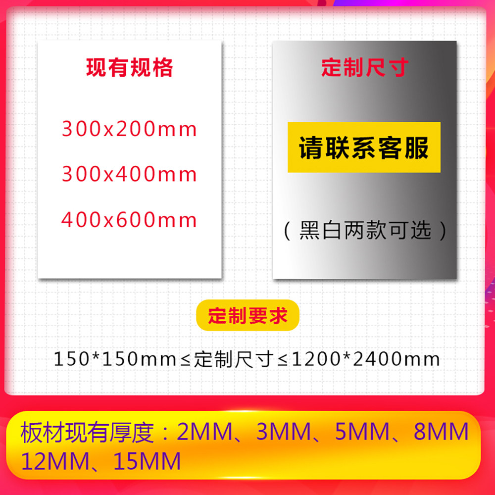 | Цвет: | Черно -белые индивидуальные другие спецификации для обслуживания клиентов, Белый 200*300*2 мм (один кусок), Белый 200*300*3 мм (один кусок), Белый 200*300*5 мм (один кусок), Белый 200*300*8 мм (один кусок), Белый 200*300*12 мм (один кусок), Белый 200*300*15 мм (один кусок), Белый 300*400*2 мм (один кусок), Белый 300*400*3 мм (один кусок), Белый 300*400*5 мм (один кусок), Белый 300*400*8 мм (один кусок), Белый 300*400*12 мм (один кусок), Белый 300*400*15 мм (один кусок), Белый 400*600*2 мм (пакет из пяти частей), Белый 400*600*3 мм (пакет из пяти частей), Белый 400*600*5 мм (четыре части), Белый 400*600*8 мм (пакет из трех частей), Белый 400*600*12 мм (один кусок), Белый 400*600*15 мм (один кусок), Черный 300*400*3 мм (один кусок), Черный 400*600*5 мм (один кусок) |