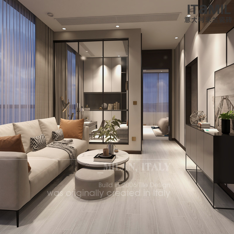 Северная имитация сплошной древесины кирпич серая гостиная.