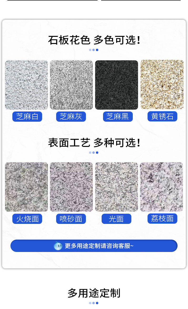 | Цвет: | Sesame White (панель/Луян), Кунжут Грей (панель/Луян), Sesame Black (панель/Луян), Желтый цвет ржавчины (магазин пола/Луян), Golden Ma (Dibu/Luyan), Черный (пол/Луян), Китай Блэк (панель/Луян) |