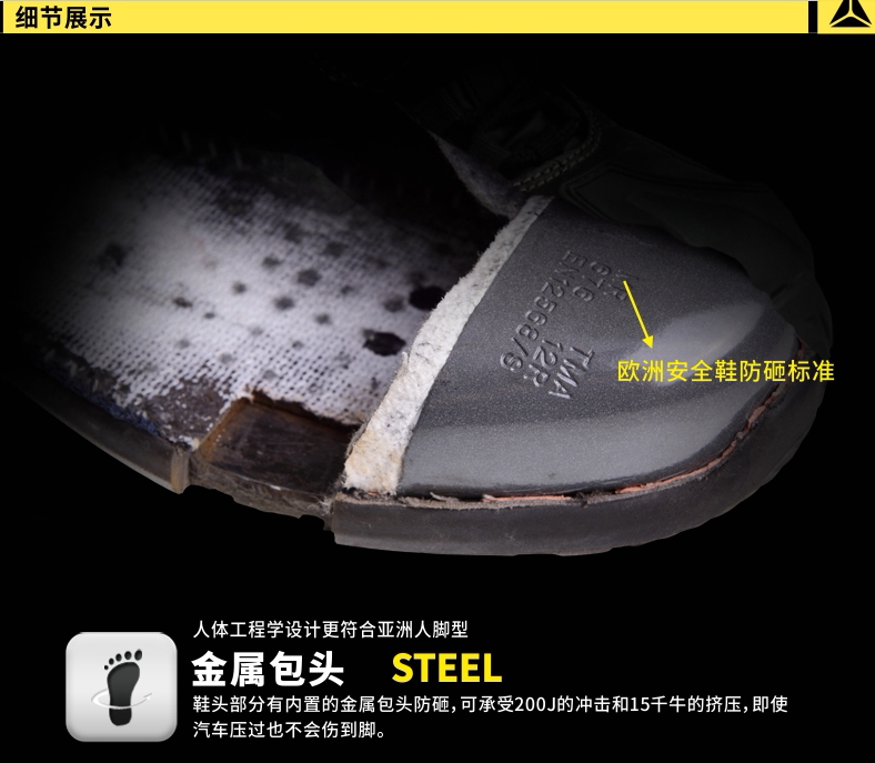 Безопасная обувь оснащена анти -смашной защитой Baotou, что может быть доступным200Влияние Цзяо Эр15Сжимание Qian niu может противостоять сопротивлению шипа1100NСущность