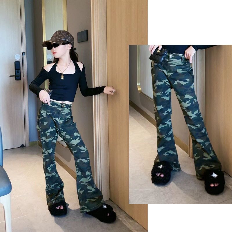 Ретро камуфляжные осенние джинсы, приталенные штаны-клёш, штаны, популярно в интернете, в американском стиле, высокая талия